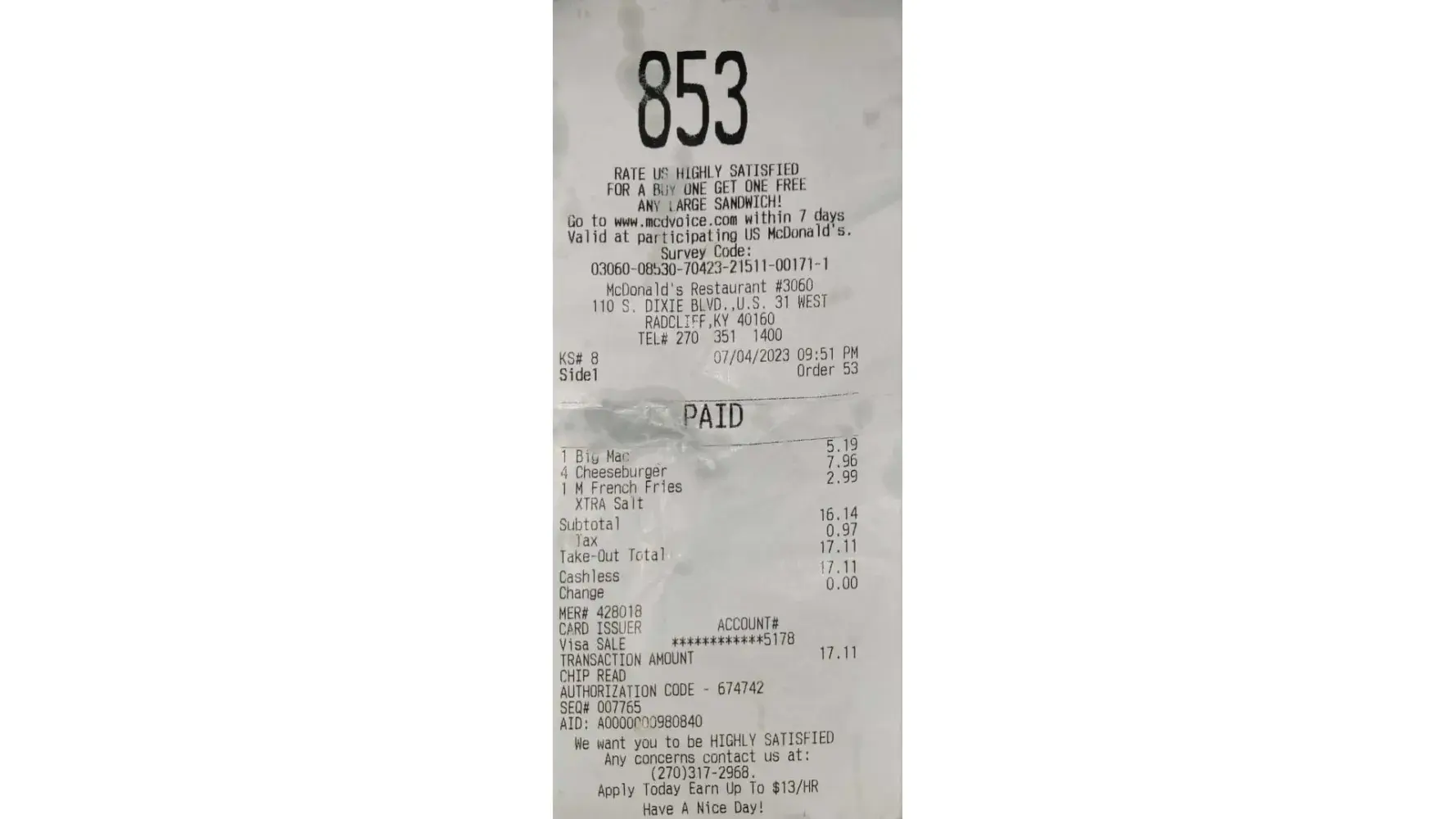I went through the drive though to place an order with a half cut sweet tea (half sweet and half unsweet). For the meal I asked for No cheese, no pickles and no onions. I paid for the order and yes did ask for my receipt. After looking at it there was an upcharge for the tea. I wrote the corporate office, and the explanation was it was manager degression...