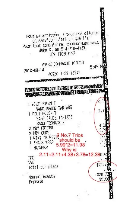 Wow. For those with little patience or time, the original complainer ordered items at McDonalds, and the total shown on the receipt was greater than the sum of the individual parts.