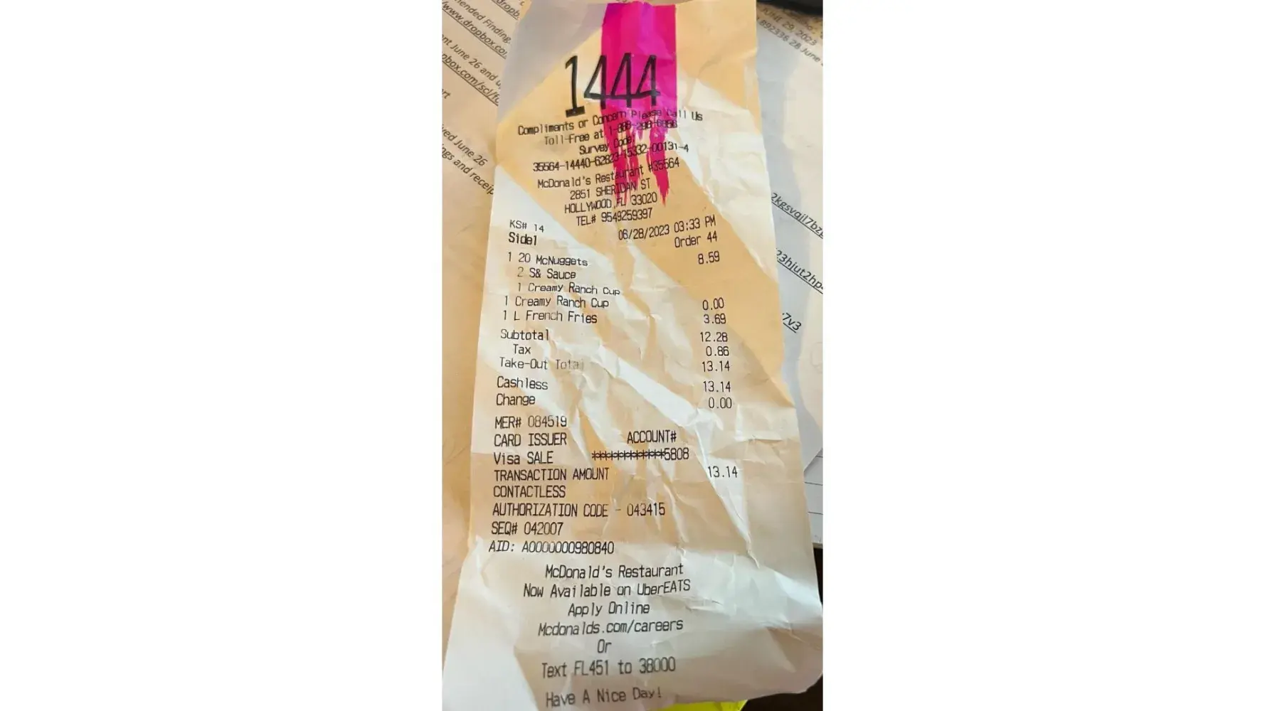 I went to McDonald's drive thru on 6/28/2023 at 2851 Sheridan Street Hollywood FL 33020 at 3:33 p.m. I placed my order for small fry and medium diet coke. I went to the first window and told them what I ordered and handed them my card. The person at the window was taking an order while charging my card. My card was returned and I went to the next window...