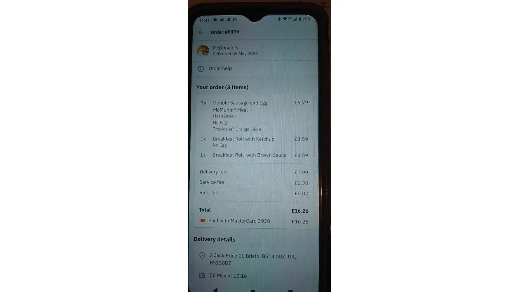 I went to Hengrove McDonald's who told me the order didn't come from them and was sent to the delivery site which is also in Hengrove, I spoke to the manager James, he was very apologetic but alas was unable to rectify my order as it had to be reordered from Deliveroo, by the time I managed to get this far it had past 11am meaning breakfast menu was unavailable. The total of my order was for £16.23 Deliveroo are only willing to refund me £10.28 so basically I am now down £6 due to your incompetent staff and to top it off only ended up with toast this morning.