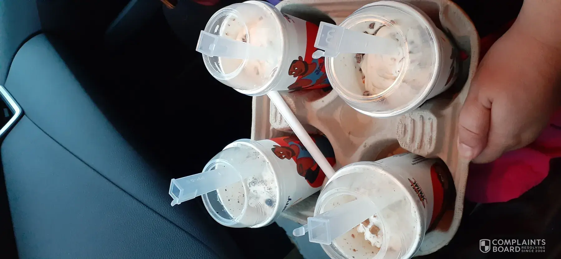 We go to mcdonalds many times during the week, and many times we get mcflurry s, this time we got 4 mcflurry's sept 5th., we were moving so went to get those 4 treats which we buy often .was very dissapointed, the cups were like half full .I did take a picture .we were too busy to just go back at the teller and too many cars...so took some pictures instead to make a complain ..we often get a mcflurry and this is the first time this happens .would like to have 4 more especially for the price I paid for the 4 mediums .thanks ...