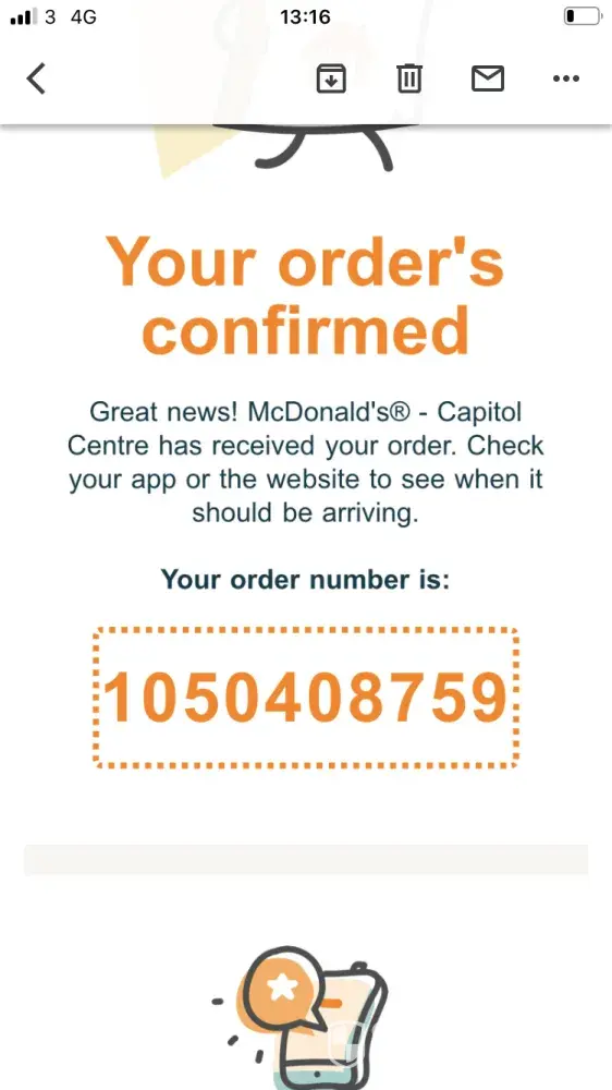 Order number 1050408759 on 26/10/20 ordered via just eat for Capitol Hill McDonald's. Order tracked 35 minutes but not delivered. McDonald's claim not their problem but just eats problem. Paid for 2 burgers. Claimed order delivered. Not happy Just eat have not refunded me and McDonald's have not refunded me.