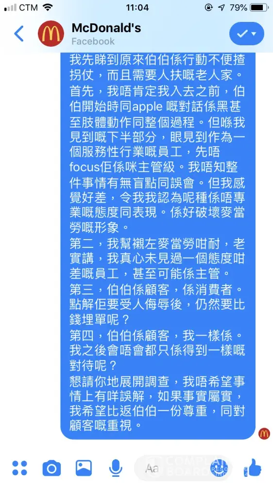 I've sent a complaint letter in Chinese via FB messenger to the service team from McDonald's Macau. However I know they've already have a look on my complaints, but they did not reply me after a day. I hope this complaints-board can give me a response, otherwise I will have further action against this case.
