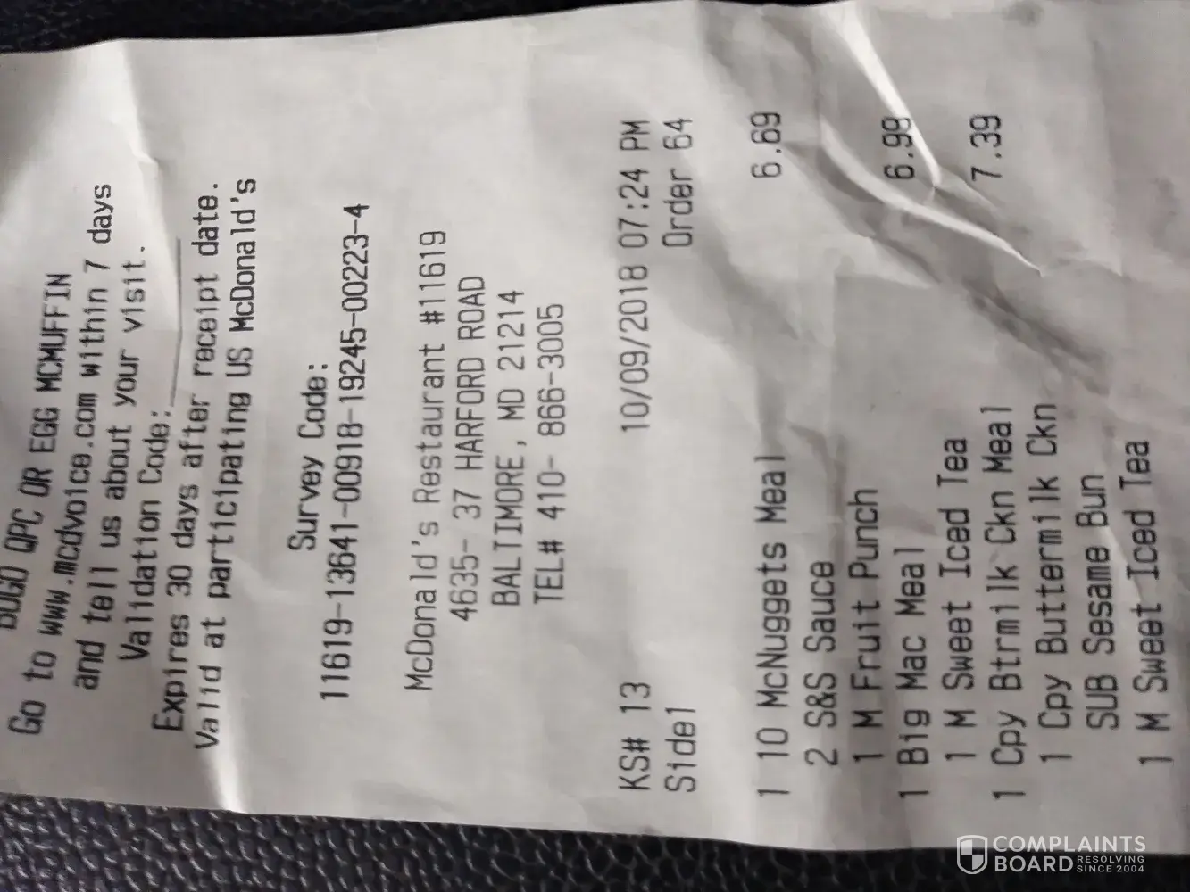 Very disappointed with wait time and food. On 10/9/18 I was the second car in line and ordered and paid for my food at 7:24pm. I did not get my food until 7:36 pm. I ordered 3 meals--a 10 pc. Nugget meal, a big mac meal and a buttermilk chicken meal. All medium sized. My food was lukewarm, fries were over cooked, the top patty of the burger was missing meat as if a bite had been taken out of the patty and the chicken patty was tough and overdone. The young lady at the window said nothing during my wait and looked as if she wanted to apologize but did not do so. I checked to ensure that all of my items were in the bag but did not inspect my food until I got home as I didn't think I had to other than ensure it was all there. I was too tired to return the food as I have a toddler who was hungry. This is the closest McDonald's to my home and each time I visit there always seems to be an issue where I have to request missing items or burned food. This is not fast food. If there are only 2 cars in the drive thru and I drive right upnto the order window, I should not have to wait that long for mediocre high priced food. I do not see myself returning to this location anytime in the near future. This is unfortunate as my 3 year old is in love with chicken nuggets. Other than better management of the food line I am not sure how to resolve the quality of the food. However a resolution to my situation would be to be reimbursed for my food which was not enjoyable at all. This visit left me wishing I had gone home and cooked or visited burger king.