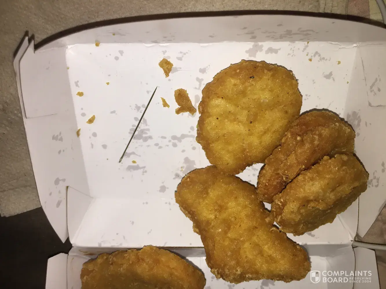I got two 10 pieces chicken nuggets and when I got home I found a sewing needle in one of the boxes.i have a picture of it in the box, It didn't stick me I just noticed it when I went to grab another one. It was probably an accident but I just want to let you guys know to check things because that could of hurt me bad