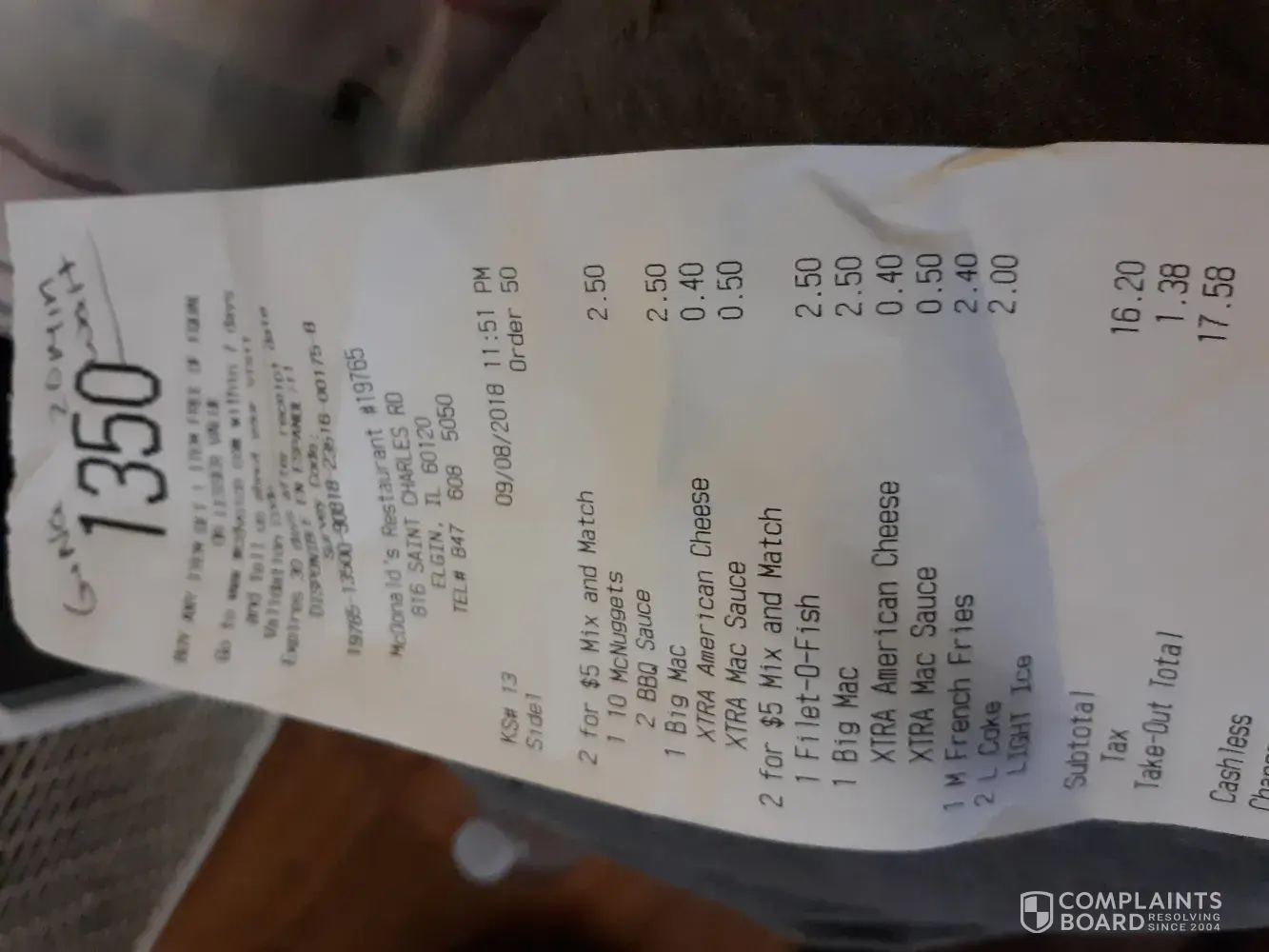 I stopped at the above McDonalds on Sep 06, 2018 at approximately 4pm and ordered two fish filet sandwiches with extra tartar sauce and a senior coke to go.