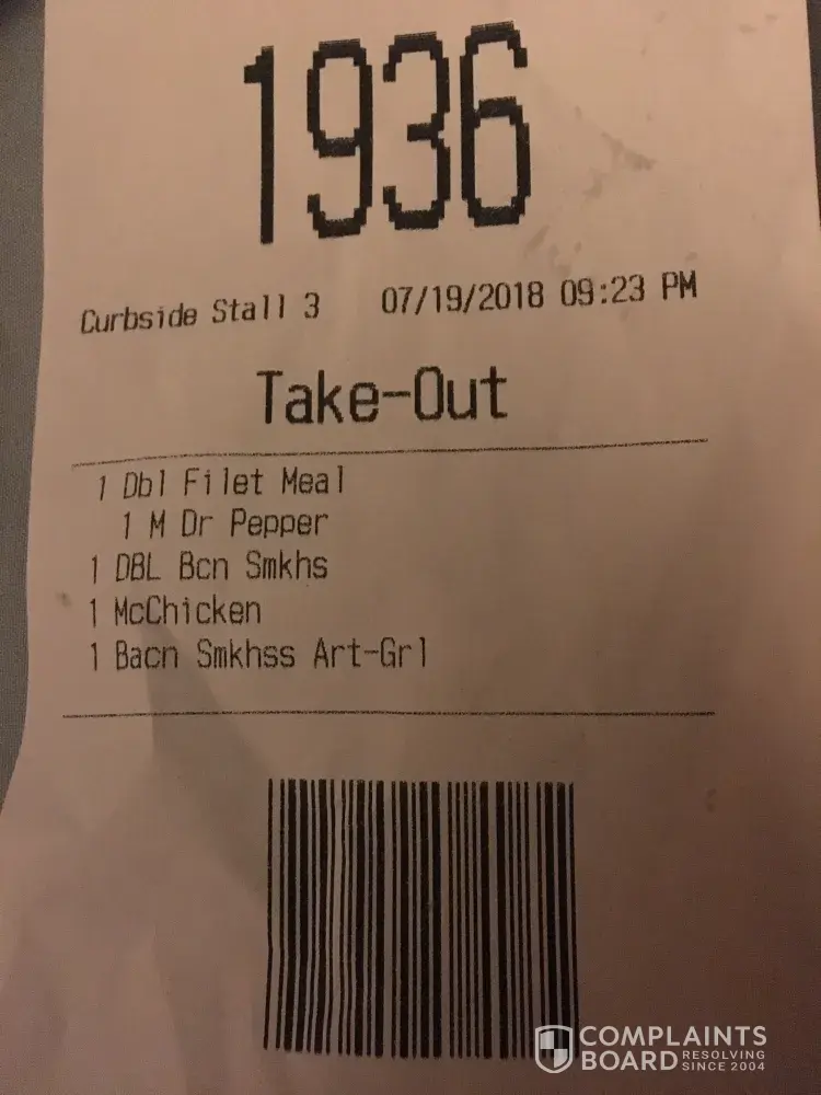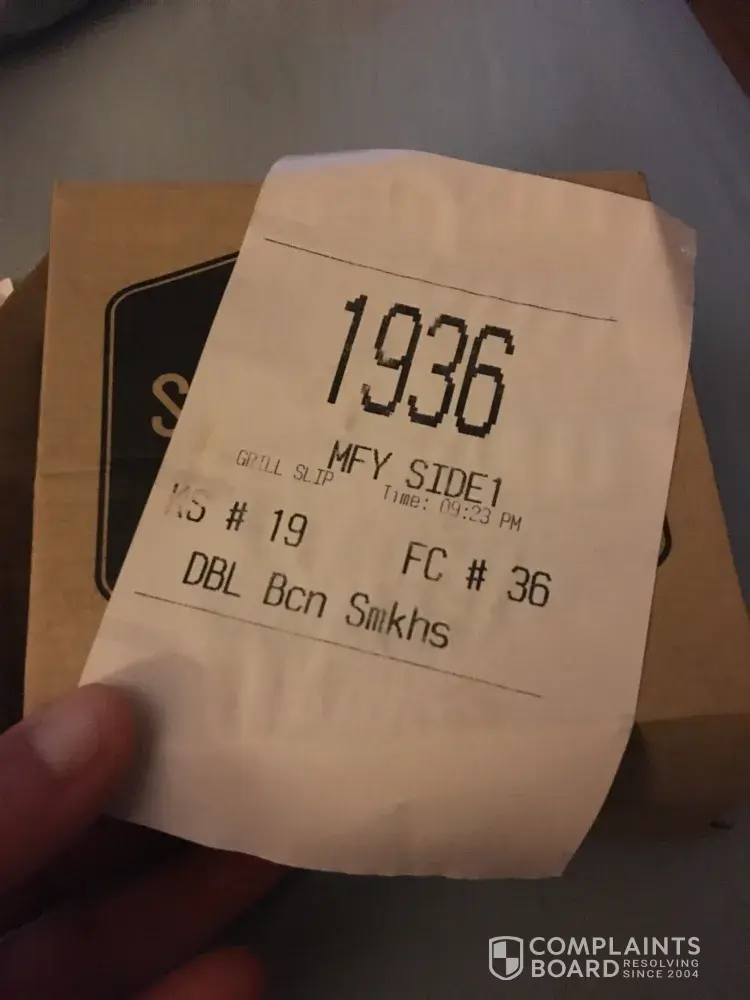 Wait time was 24 minutes after parking. First time food was brought the drink was forgotten. Checked the bag for the food. Sandwich missing. 1 box marked "double bacon smokehouse". Grilled bacon smokehouse missing. Finally got other sandwich. Got home and grilled sandwich was in the double bacon smokehouse. No double bacon smokehouse. The one that was thought to be missing had no bacon.