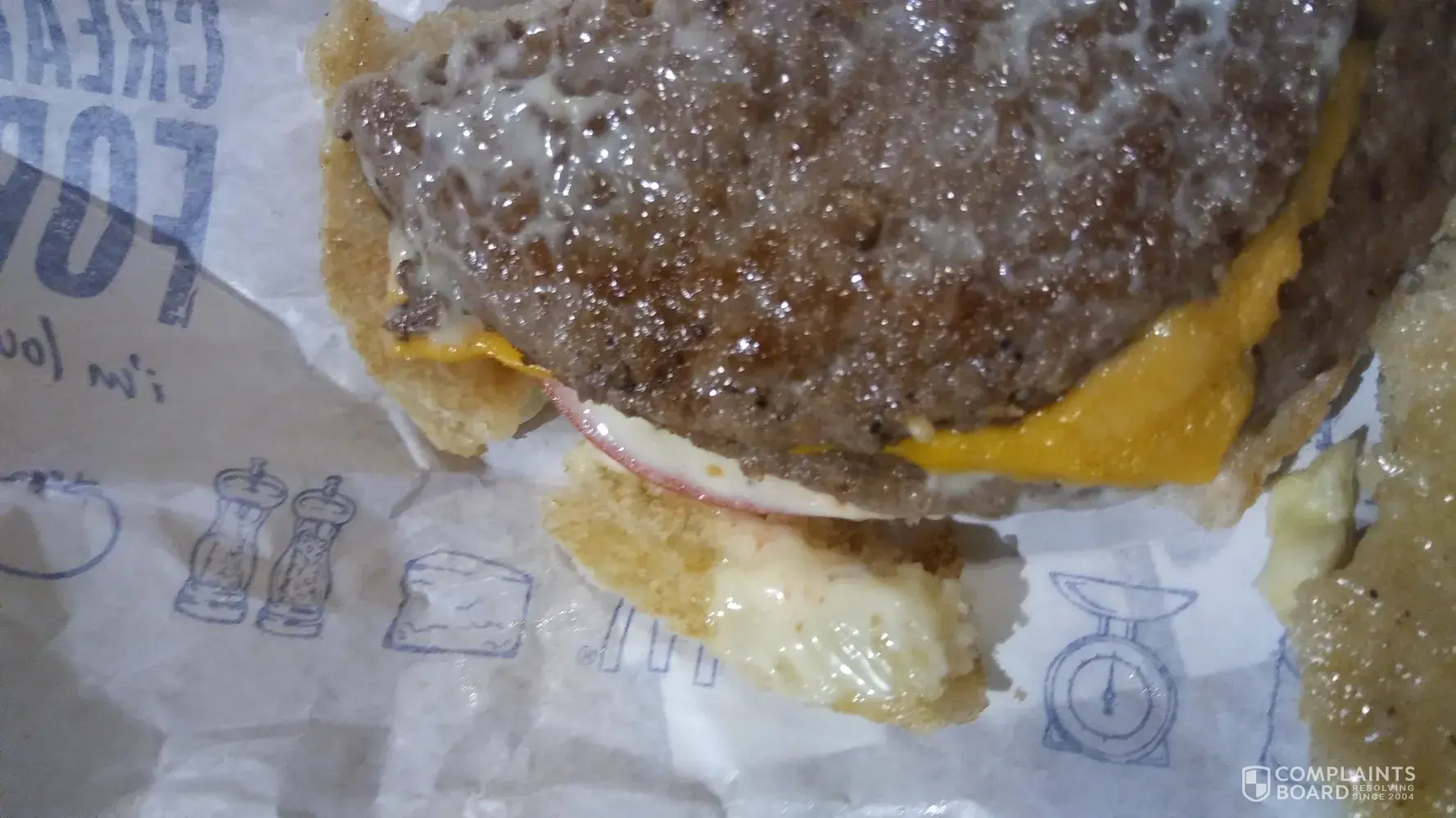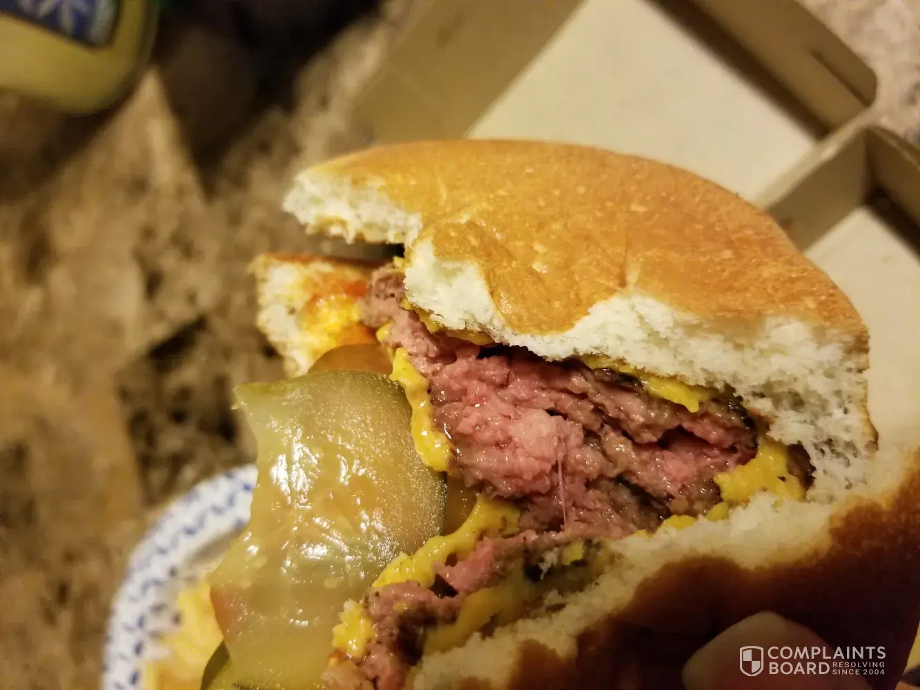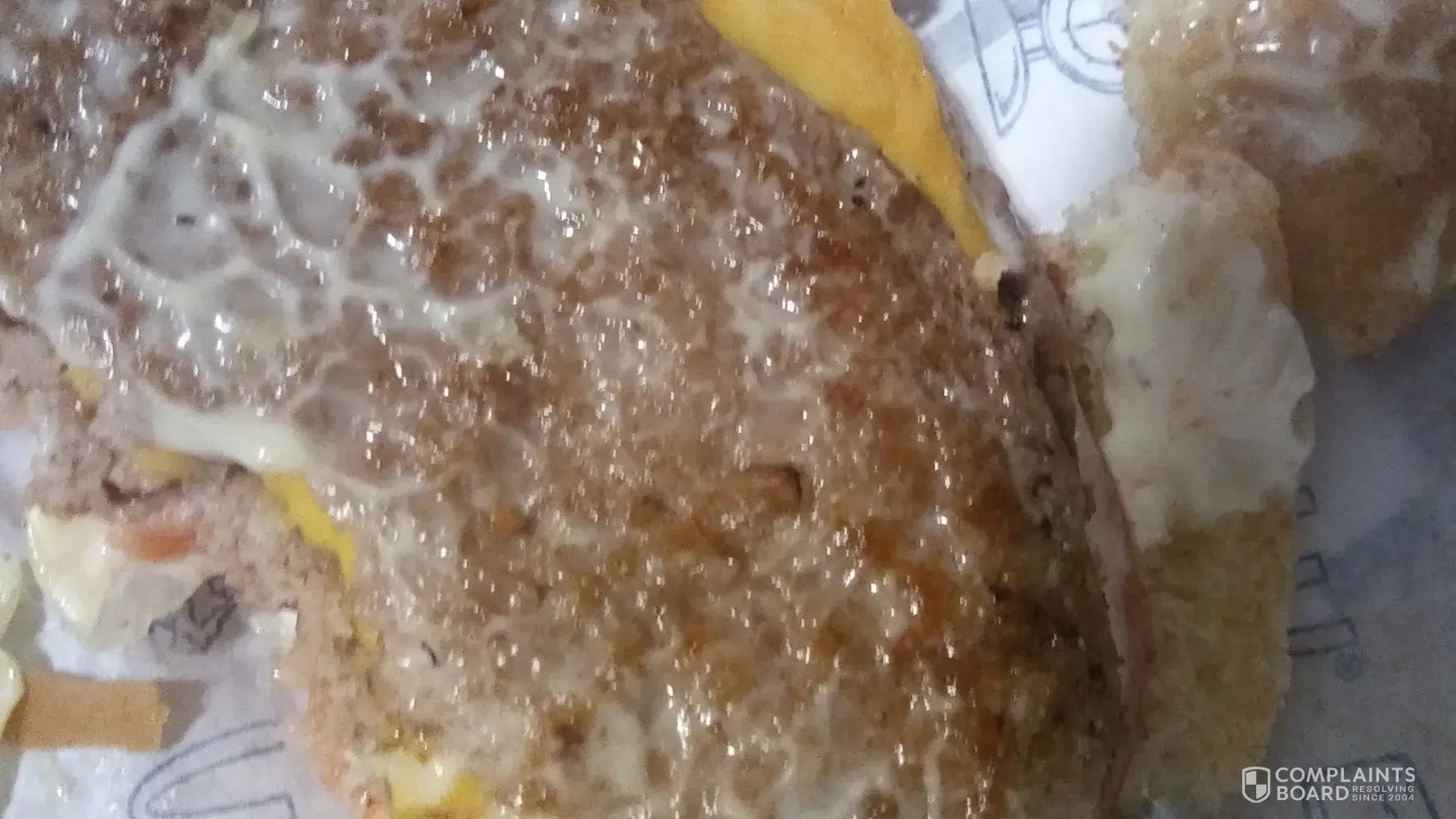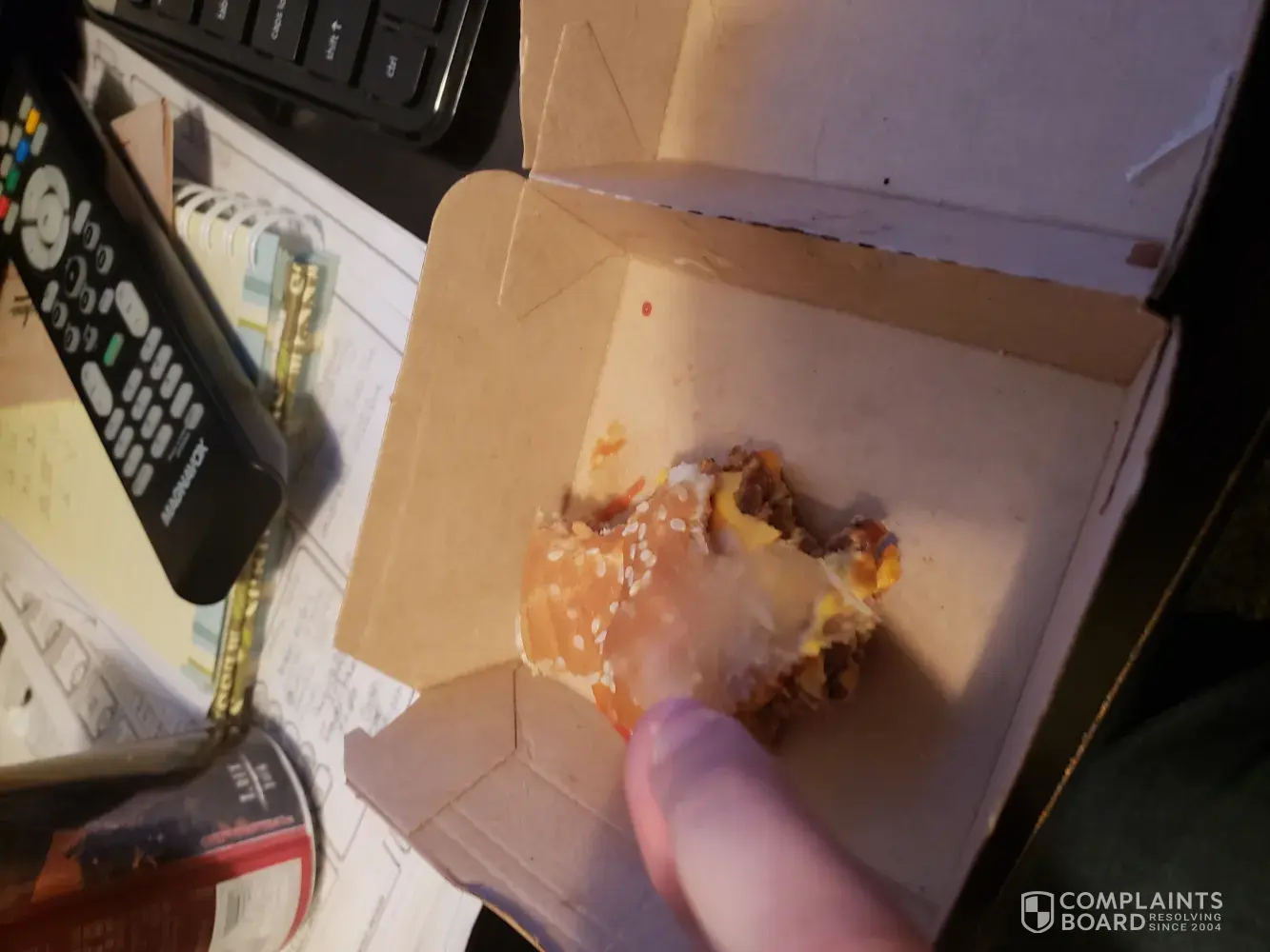 I purchased a Daily Double with No onions, Light Lettuce, and Xtra Mayo, Medium Fries (Well Done) and a Large Dollar Coke for my Fiance'. While her fries was Hot and fresh she began eating them on the way home and once we arrived home she began eating her burger and i stepped outside to go to the car and she then came outside to tell me that she needed to talk to me about her burger. She asked me to look at her burger and i examined it with an flashlight and i told her what it was.