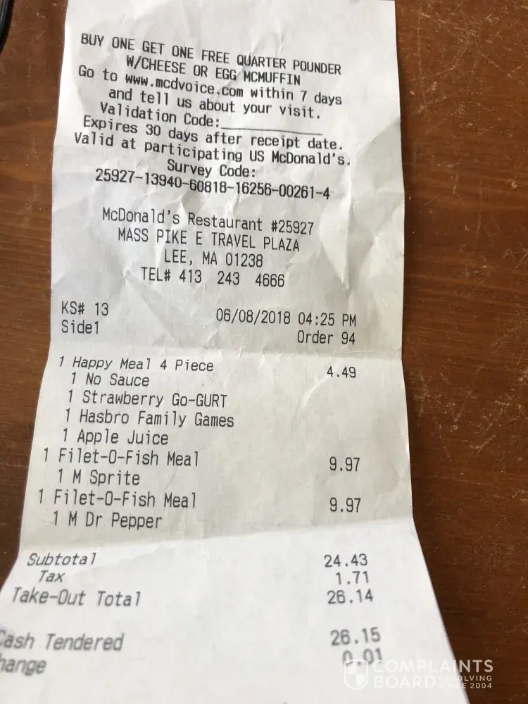 Outrageous that a McDonakds can raise there prices just because they are at a rest stop on I90. $9.97 for a Fillet-O-Fish meal! What happened to McDobalds caring about its customers? What if I was on a very limited budget with kids? I donate to Ronald McDinald House but guess if they are charging like this in other places they should have plenty of money. I will never stop there again and will make sure everyone I know that travels that way never used it either!