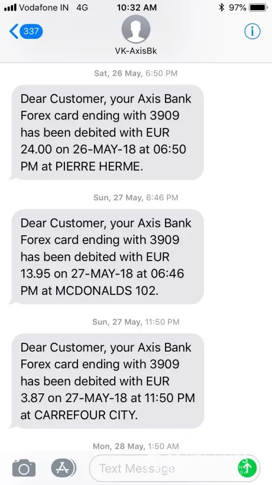 The server then told me that this swipe failed too. I was very surprised. Just then I received two SMSs on my phone confirming that both Axis and HDFC acocunts have been debited 13.95 Euros each.