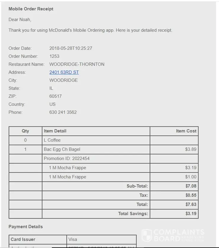 I went to the McDonalds at 2401 63rd street on May 28th and placed an order on the mobile app using the Buy One Mccafe beverage, get one free. I never received a paper receipt and was told to pull to the second window where I received my two Mocha frappe's. Later in the day I checked my digital receipt in my email and saw I was charged for a bacon, egg, and cheese bagel which I never ordered. When I called and talked with the manager I was told I had to have a paper receipt in order to be reimbursed or else he couldn't help. So I was hoping to somehow be reimbursed using this email receipt that I will attach. Thank you for your time.