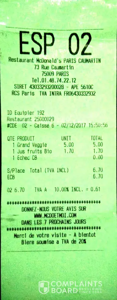 On 2nd December 2017, I had Veggie burger along with some drinks, For which the Mc Donald charged me 6, 70 EUR, the Details are follows: