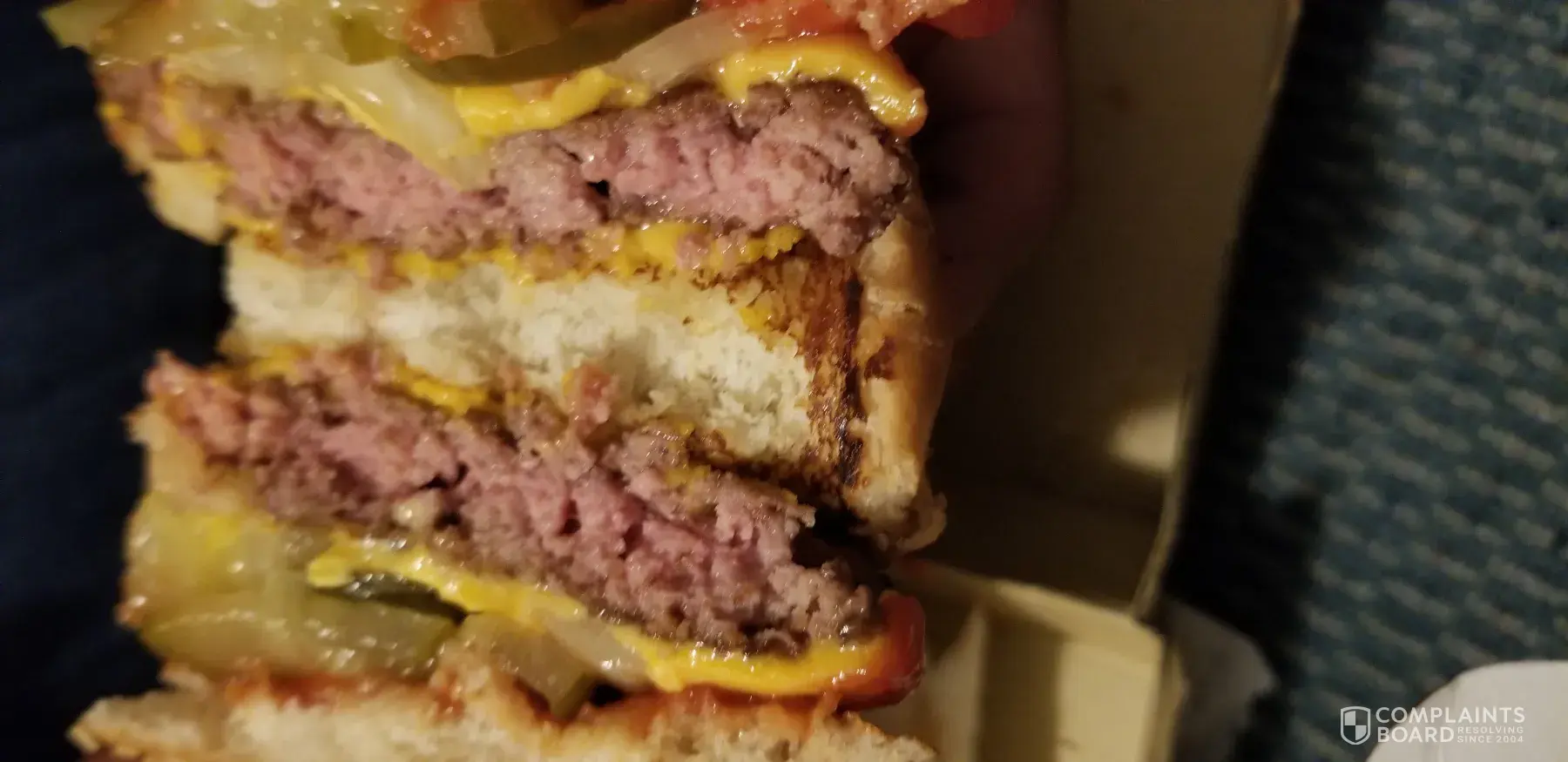Order a quarter pounder the whole meat was raw in the inside pregnant wife almost ate the the nuggets were cold and the fries were old tasted like rubber and were cold .