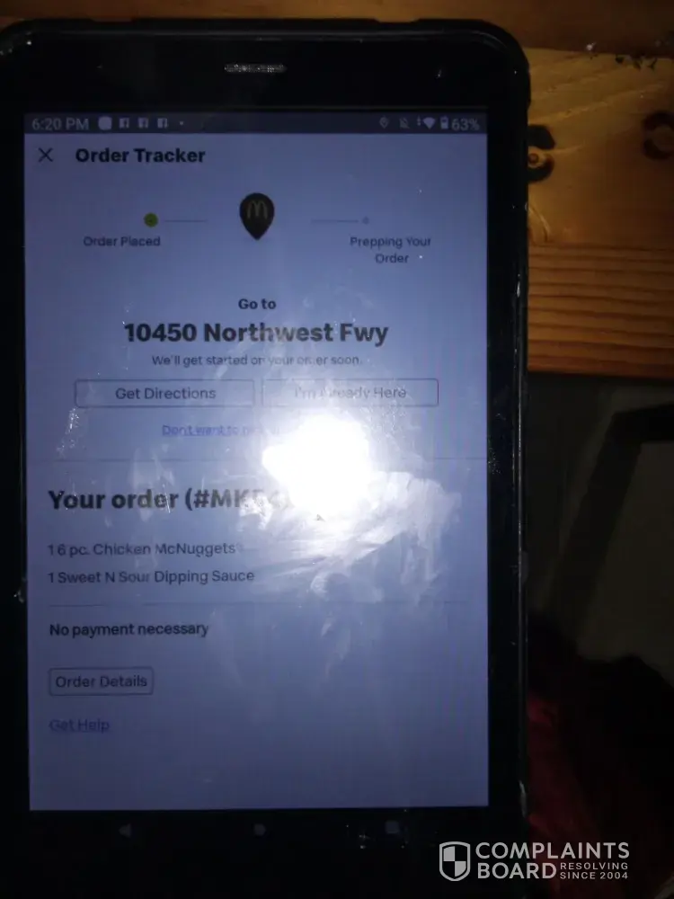 I just placed a mobile order number mK54 and was sure the pick itt up at 10350 northwest fet. .I'm currently starving at this point because I walk about a mike to the store a s the massager and cadhier bith are adamant that there isbt an order the for me ..