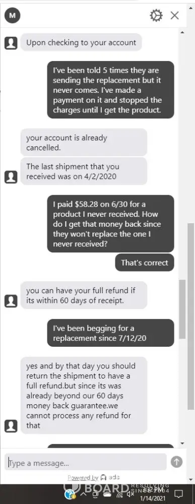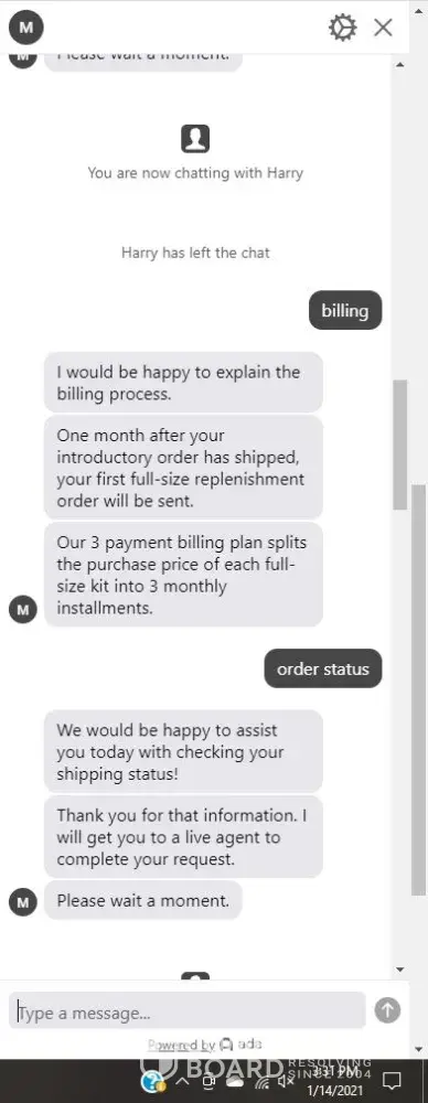 Desired outcome: I’d like this extra bill resolved or to send back whatever unopened products I have.