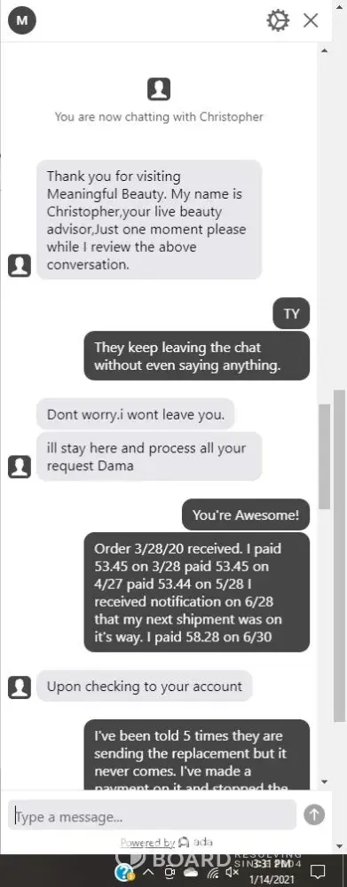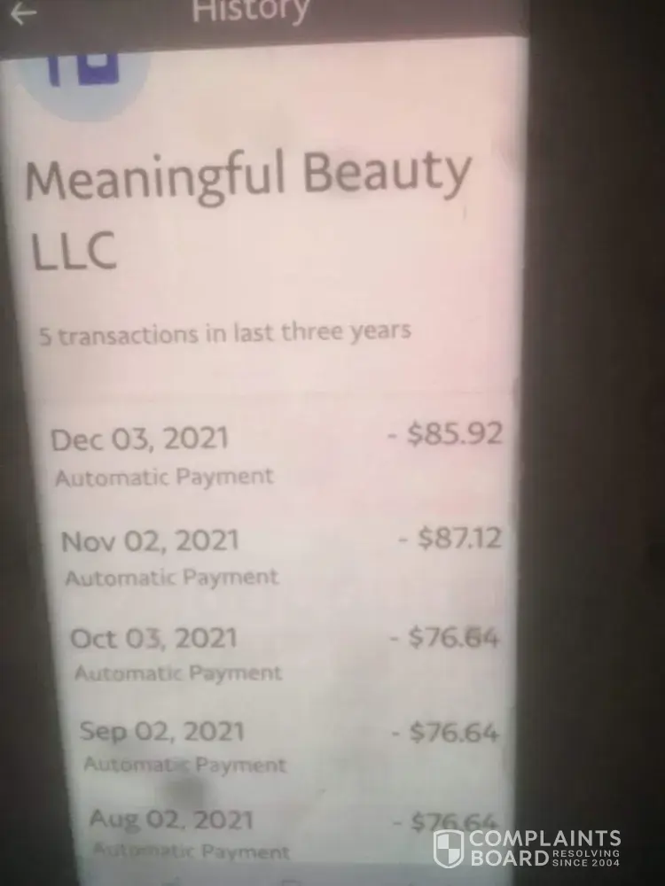 I was ship the package back in march and received it and when I did the invoice said this is not a payment I didn't have a balance. They have my credit card information and charged it it was $207 for a 7 piece kit. I received a letter yesterday stating that I owed $138. Customer service was very rude and very unprofessional. They said they shipped it out because my credit card did it go through. 1 that is the wrong price + 2 she could not tell me why I haven't received a statement before now. I know meaningful beauty does not ship out anything until it's paid for. This is a scam i'm a single mom and I told them I wasn't paying it because I don't owe them anything. I would not get wrapped up with these people if I were you.