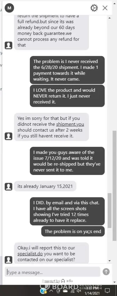 On 7/12/20 I reached out via chat and informed about my order status that was placed on 6/26/20. I never received and was told it would be shipped out for replacement. On 9/28/20 I reached out again and was told they see the replacement was put on hold by mistake. It would be shipped out that day and I should receive it within 5 to 7 business days. On 11/3/20, I reached out again with the same response and apologies. I was then told the order had been on hold for 2 months and guaranteed it would be shipped that day. Then again for the last and final time on 1/14/21 I reached out and was told if I never received the order, I should've inquired on it within 2 weeks ( which I did ) and was told it would be reshipped. He ( Christopher ) then stated I could've returned the product for a full refund if I hadn't waited so long! Now I've received a collections notice for $104.87 for the remaining balance owed. I've even paid over $50 for the product I still never received.