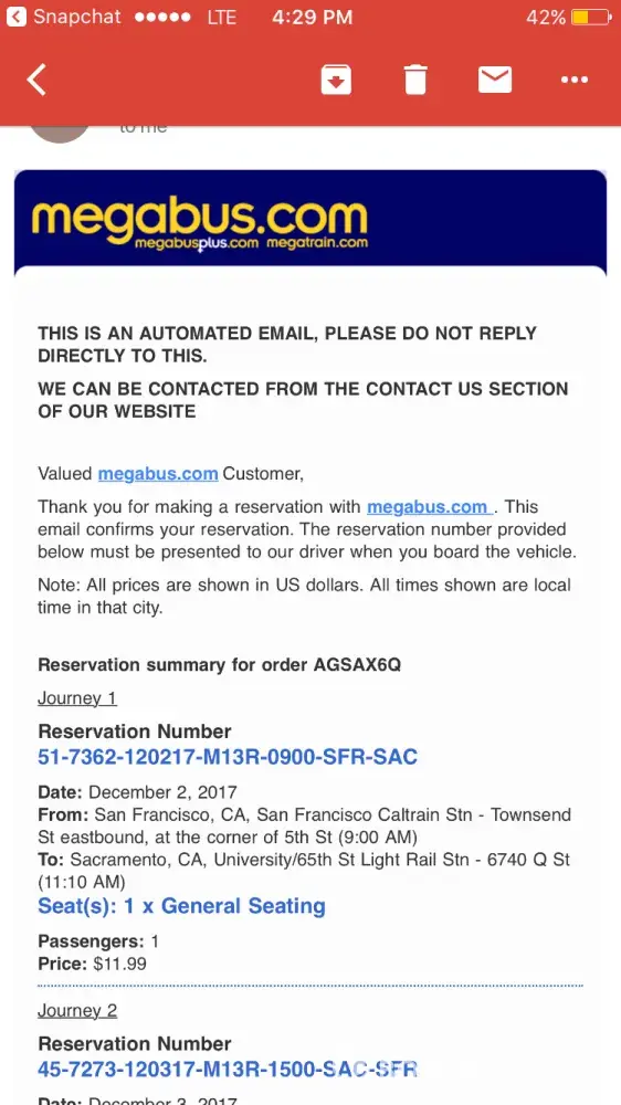 There we learned someone had a weapon on the bus, and that was the code for us to stop. Just concerned at this time of safety. What can be implemented to prevent such unsafe and dangerous situations for the Megabus? We all could've been hurt. And is there anyway those of us who were on the bus get reimbursed for it? My boyfriend bought my ticket to go and visit him. What if the person with the gun was not exposed? Thanks for your time.