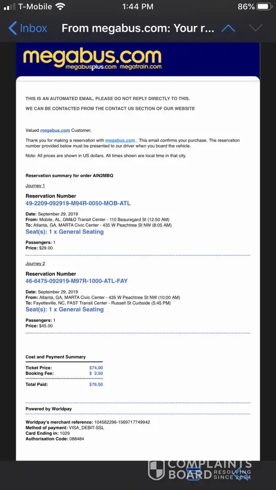 Hello, Reservation Numbers [protected]-M7R-2230-MEM-DGP- $15.00 [protected]-M7R-0915-MEM-DGP- $52.74 I would like to file a complaint in regards to the bus not showing up in Memphis, TN on October 23rd, 2019 at 10:30pm and not having the support from Megabus to make this right! The bus did not show up, I was told the bus was running late not that it...
