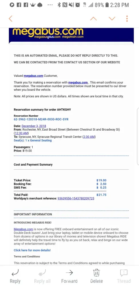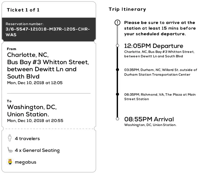 September 11, I booked 4 bus tickets of Megabus from Charlotte, NC to Washington D.C. on December 10, followed by 4 bus from D.C. to New York and the flight to Beijing, China. I got the reservation number 3/[protected]-M37R-1205-CHR-WAS and the confirmation with the address of the station for departure, Bus Bay #3 Whitton Street, between Dewitt Ln and South Blvd.