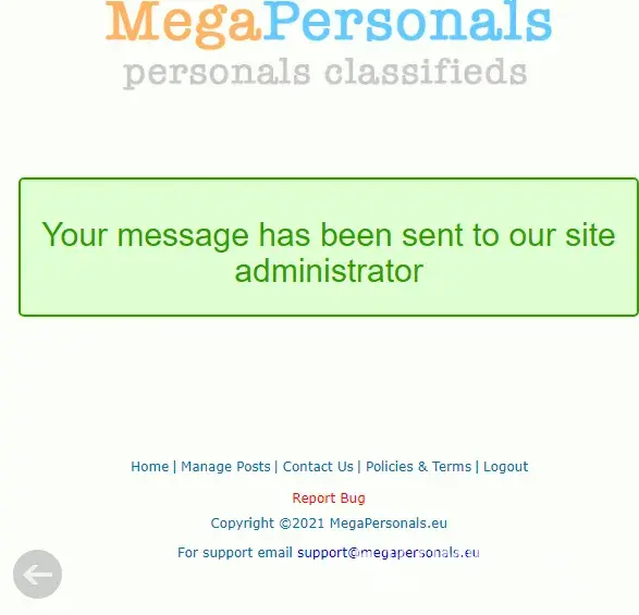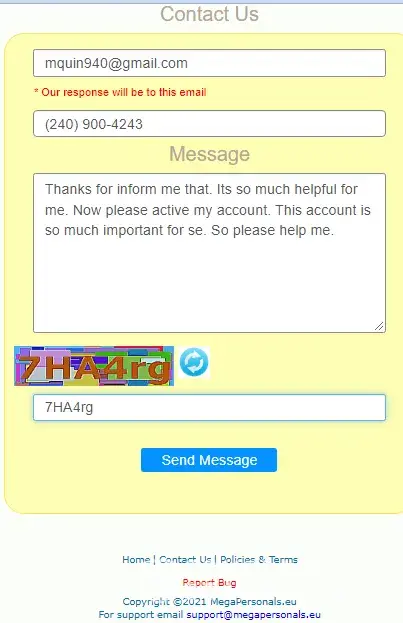 I have sent Megapersonals.EU 2 emails to "contact us" email and 3 to "support" email I have explained 5 times now that all of a sudden I can't log into my account because when I try it says "New Device Detected" which is in error because I am using the same device as always(my cell phone!) Underneath this message it states "we have sent a code to ur email please enter the code check SPAM it may be there" The problem is I have been checking all of my emails for over a week now maybe longer every single day SPAM included and have yet to recieve any email from them so I contacted the company 5 times as I mentioned at the beginning of this complaint and still no response I even tried logging out and back in and refreshing the page I tried everything I could think of and still NO CODE!, NO RESPONSE EMAIL!, NO ABILITY TO SIGN INTO MY ACCOUNT! I can't post anymore and I have been posting on this website for a coulle years now and never had any problems before! HELP! What else can I do? The only thing I haven't tried was calling them but up until just a few mins ago I wasn't aware they had a # to call wasn't aware that was an option!