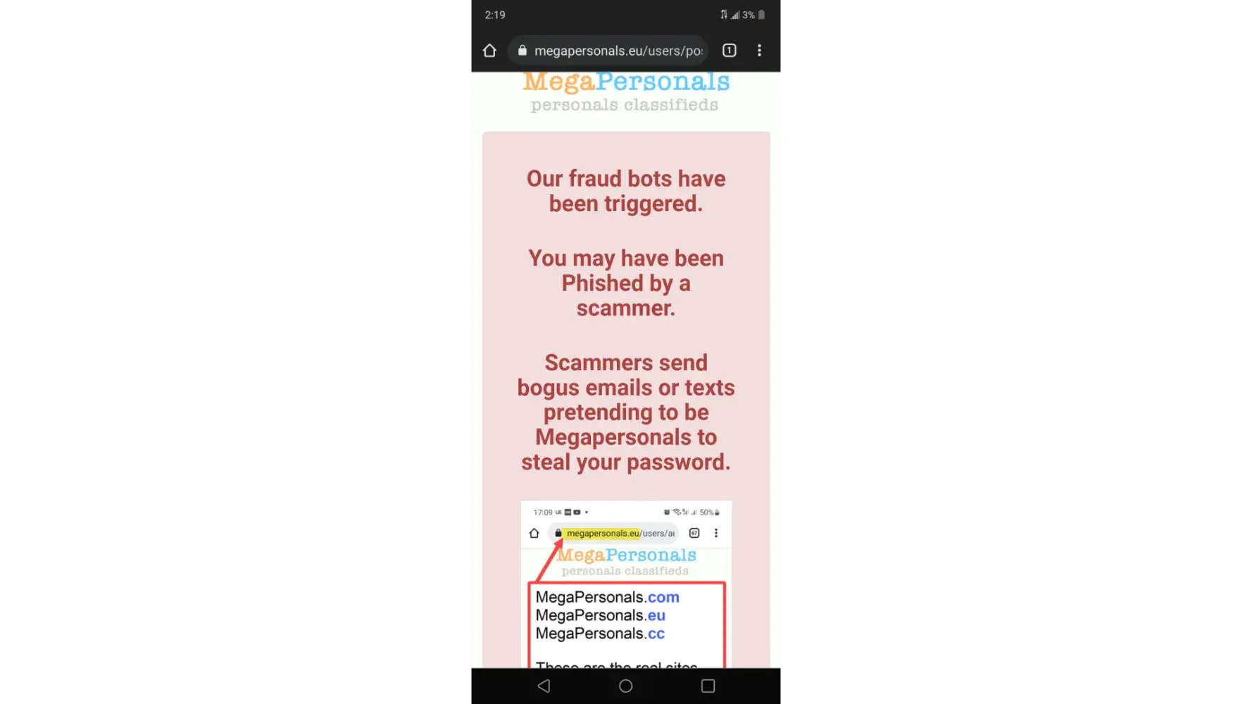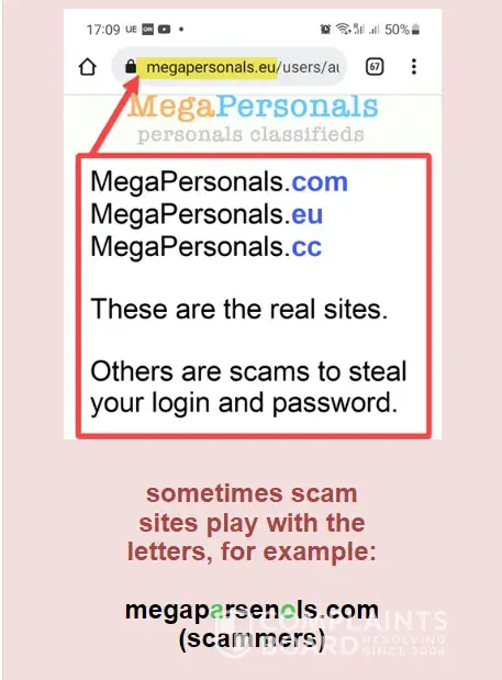 TO EVERYONE WHO POSTS ON MEGAPERSONALS.EU IF U EVER RECIEVE ANY TYPE OF MESSAGE CLAIMING TO ME FROM THE WEBSITE U ARE POSTING ON DO NOT CLICK ON THE LINK! IF U READ THE DISCLAIMER ON THE WEBSITE U WILL SEE THEY STATE THEY NEVER SEND TXT MESSAGES AND WILL NEVER ASK U TO CLICK A LINK AND GO TO A DIFFERENT WEBSITE TO "VERIFY" YOURSELF NO MATTER WHAT THE MESSAGE SAYS WHETER IT'S "UR ACCOUNT IS GOING TO BE DISABLED CLICK THIS LINK TO VERIFY" OTHER ONES GO SOMETHING LIKE THIS "This is megapersonals.EU we are moving our site to a different website here's the new website click the link and sign in OR MY PERSONAL FAVORITE... They pretend to be an inquirer and everything seems normal then all of a sudden they will say "prove u are real or legit click this link go to this website and sign in to verify urself! NEVER EVER EVER FALL FOR THIS ALL OF THESE ARE SCAMS AND MANY MORE THEY GET PRETTY CREATIVE SOMETIMES AND CAN SEEM PROFESSIONAL DO NOT MAKE IT EASY FOR THEM DO NOT EVER CLICK ANY LINKS SENT TO UR PHONE VIA TEXT FROM ANYONE ASKING U TO GO TO ANOTHER SITE AND LOG INTO UR ACCOUNT! THAT IS HOW THEY STEAL UR INFO AND UR ACCOUNT! WHICH LETS KEEP IT REAL IS STEALING UR MONEY!💰 I have been lucky enough not to be a victim of this heinous CRIME because I have been a victim of other fraudulent activity and scams so now I am overly cautious so when I saw that txt message this one was claiming that my account was disabled not counting on the fact that I would go onto the actual website to verify this info and lo and behold I could sign on just fine then I read the DISCLAIMER on the REAL website and found out that they NEVER send text messages to their users EVER PERIOD! and explicitly warn us not to click any links these are all SCAMS! So I've made it my mission and priority to inform as many men and women about this! In fact whenever I get a group txt scammer I always warn everyone else in the group that it is a scam and don't be a fool! Or victim don't let them win! They are the lowest of the low scumbags of the world! I still receive these type of texts all the time and it is very annoying but when I feel like texting back I tell them right where they can stick it and cuss them out and tell them they should be ashamed of themselves and etc. Etc. Even though I know it won't stop them it makes me feel better to get it out and of course I block them but let's face it they have endless phone numbers@ their disposal many are from other countries around the world! Its as if they are watching and waiting for me to post because shortly or sometimes right after I do here comes the text messages and there's always a few somedays I wake up to these messages and I tell them I know they are a scammer and I know what they want and I will kinda tease them and say u want my account info so bad don't u that's why u never give up but guess what U might as well stop trying me because u are wasting ur time U will NEVER EVER get my account info or any personal info from me I am not new to the [censored] give it a rest and leave people alone and go get a REAL. [censored]ING JOB! Anyway just wanted to share that because I read a complaint about a poor woman who without thinking clicked on the link and typed in her email and password and I was like NOOOO! U DIDN'T! I truly thought by now everyone knew about this SCAM! but when I read what she went through it really upsetted me so I decided to write this so that it NEVER happened to anyone again! Also these aren't the only scams their are many more so just be careful and think before u click think before u open a sketchy email hint: all the emails claiming u won some sort of prize are SCAMS! First of all to win a prize u have to enter and secondly if it was legit they would maybe send an email but definitely CALL u as well! Please I know from experience it is so tempting especially because these emails seem to come when u really need the money the most but I have clicked on one before and luckily didn't have my info stolen but the email said in huge letters WINNER! So naturally I was like SWEET! I wonder what I won and opened it this to another page where I was told to fill out a "quick" survey this went on for a while then I was like let me read the small print that almost no one reads by the way because its teeny tiny on purpose so I read it and without making this story super long they had different levels silver, gold, and platinum and they all required a purchase I laughed at myself for spending probably an hr maybe 2 trying to complete this stupid survey only to find out in the end they would want my credit card info which of course I did not give them so there are lots of different types of internet, texts, email, even phone sometimes someone will call u claiming to be from SSI or something saying someone commited a crime and used ur info or u havent paid this or that sound familiar this happened to me and why I fell for it is because the woman sounded very professional, she scared the crap out of me saying the police were after me for something I don't remember and because I was frantic and not thinking rationally I told her my Social sec number she gave me a phony claim # and everything then asked me if I had ever been to Texas and at this point I was crying my eyes out I responded NO! And CLICK! Was all I heard I immediately realized that was a scam call and had I been thinking rationally I would have remembered SSI NEVER calls YOU! U HAVE TO CALL THEM AND IT TAKES FOREVER TO GET THROUGH TO ANYONE! They Will send a letter in the mail... So at this point I start freaking out worrying that my identity had been stolen and I filed a police report I was so embarrassed for falling for the oldest trick in the book but he told me it happens all the time and they scare u intentionally so ur not thinking straight so for the next year I paid close attention to my bank statements and activity I let my bank and social security know so they could keep an eye out for suspicious a