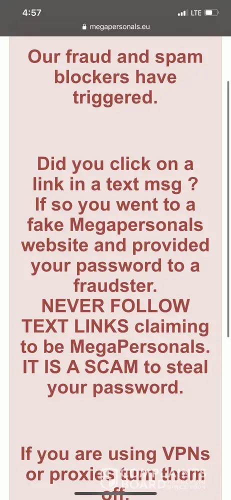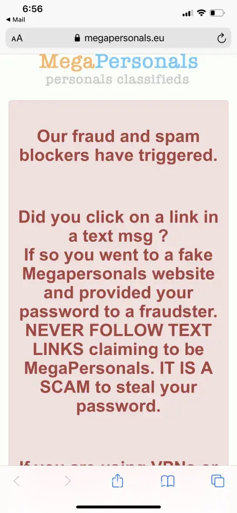 I have ben using mega personal's for like 2 years and then these scammers somehow hacked my account even though I did not click on any link or any of their [censored] text messages to verify but they still got hold of my account and when I reported it all of my accounts are now flagged for spam but these scammers are somehow still using my account information that's amazing so I have been locked out for a couple weeks and i've been doing some research and for anyone out there who having the same problems I am which were gonna have to do is change your ip address figure out how to do it on your phone either changing to static or doing it through wi fi or thru your carrier because that's what's going to work I used my old phone that I no longer have network on and I connected to the wi-fi where I am and I was able to post but megan personal still needs to fix this problem