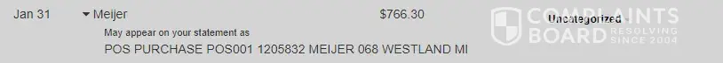 It was Jan 31, 2023 for $766.30, I have been back and forth with this issue between the bank and Meijers. I have never spent this much at Meijers ever.