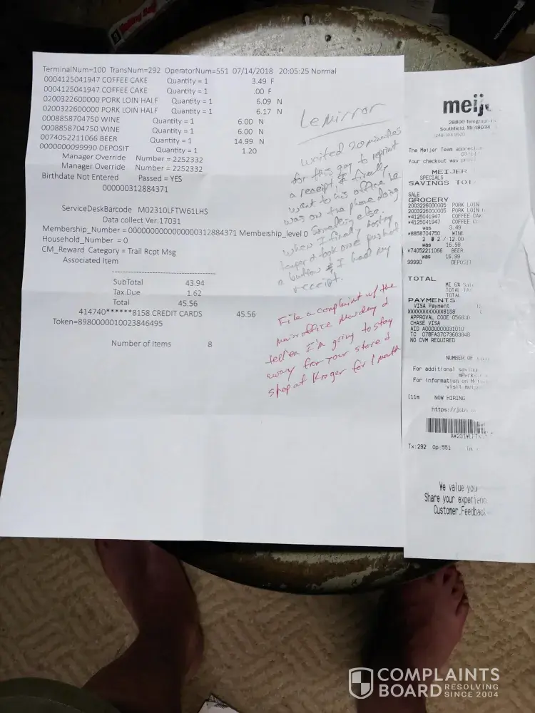I'm a regular customer of the Southfield Meijer located at 28800 Telegraph Road. I was in there on Saturday 7/14/2018, I left my 94 year old mother sitting in the car. I only needed a couple things and expected to be in and out in about 15 minutes. After paying for my bill and receiving my receipt I noticed the receipt was blank on the right side. It showed to pricing or totals. So I went up to an employee assisting self serve check outs and asked for a readable receipt. She picked up the phone and made a call, then told me the manager would print out a new receipt and bring in to me in the next 5 minutes. After waiting15 minutes and asking 3 times, I finally asked whats this guys name and where is this office he's in? They told me his name was Lemire (hope I'm spelling that correct...Le mirror). They told me his office was next to customer service desk, so I walked down there and found him. He was on the phone, saw me, didn't acknowledge me, just kept on doing what he was doing. After 5 minutes, I interrupted him and told him I've been waiting 20 minutes for him to reprint a receipt and Iwasn't waiting any longer. I shouted at him to get his attention, and told him to stop what he is doing and print me a new receipt. He stopped, pressed a button and handed me the new receipt. It took him a second to complete the task, yet I had to wait 20+ minutes. This is inexcusable! This jerk should receive additional training on How to treat your customers.