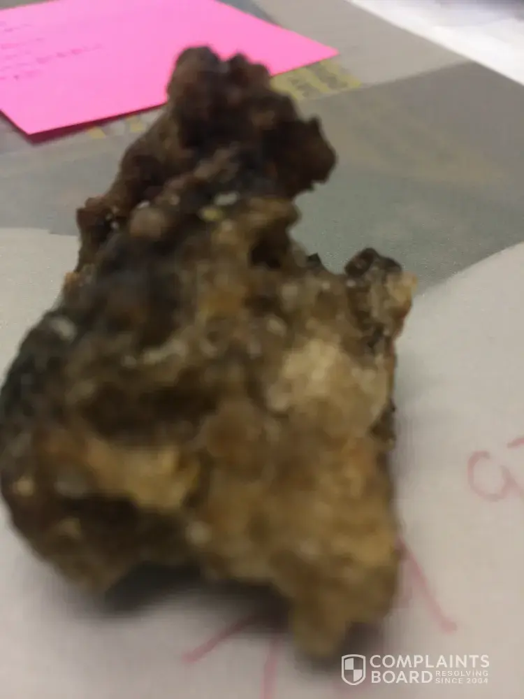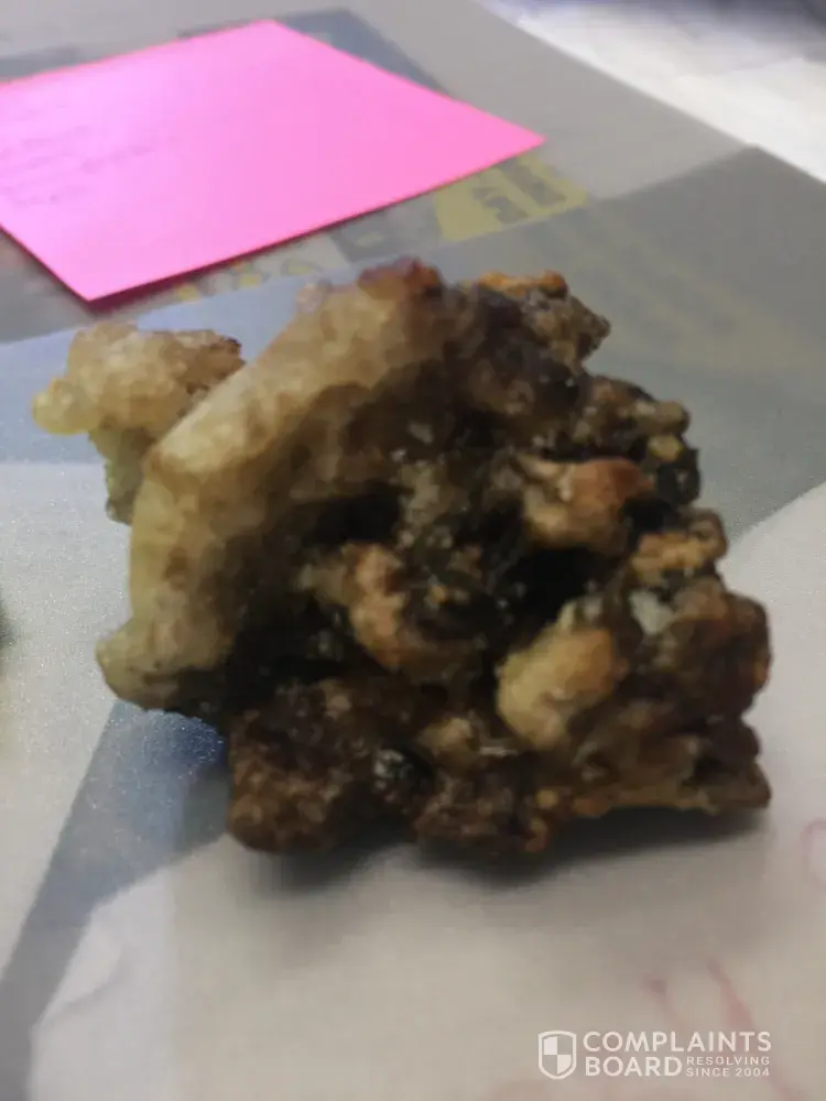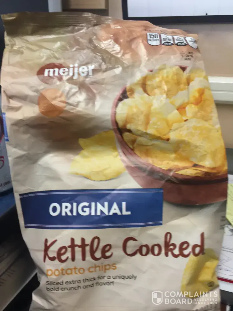 I purchased meijer brand kettle cooked potato chips after eating some of the chips I found a quite large chunk of something in the chip bag, it appears to be maybe a chunk of not good potato? Needless to say it was not very appropriate to see this in the chips. I feel I should receive some type of compensation for this. I've provided a photo of the item found in chips, the chip bag and the receipt of purchase.