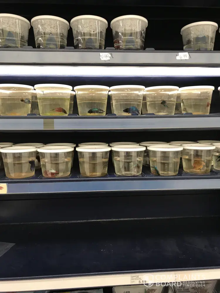 I'm pretty sure this is unacceptable. Top shelf has 1/3 water in it. Betta fish water must be changed at least every other day with a full bin of water. All of them are swimming in their own poop. Yeah this isn't a great way to sell animals. Meijer should not sell pets unless they take care of them. Nothing more to say. A picture is worth a thousand words.