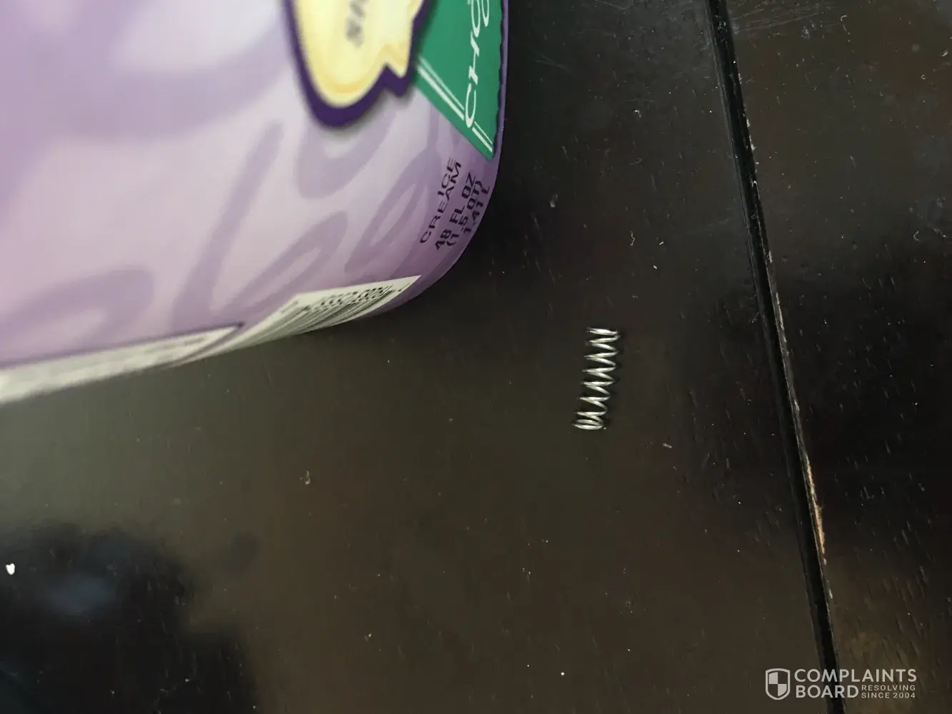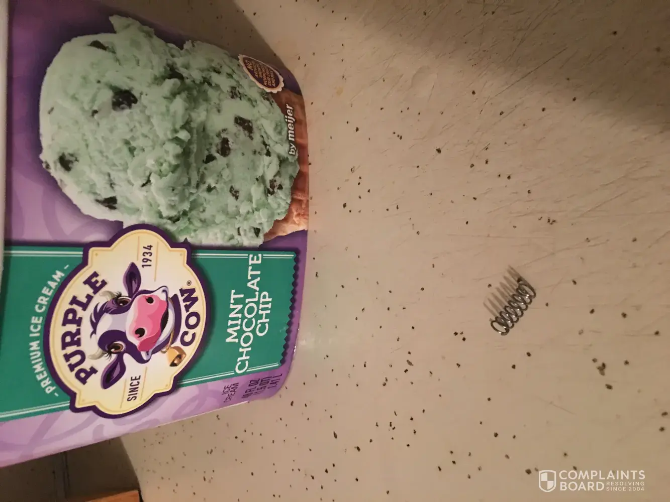 About a month ago I purchased the Purple Cow Mint Chocolate Chip Ice Cream and last night while my 9 year old son was finishing the last of it he discovered 2 small metal springs in the ice cream. Now as a mother of a 9 year old and 4 year old who love ice cream I was in disbelief and was very thankful it was my 9 year old who discovered this and not my 4 year old who would of prolly just swallowed it. Also when I tried to contact your customer service number last night I spoke with a gentleman who I am almost positive hung up on me. This is very unacceptable and I feel that this should be looked into and I should be compensated.