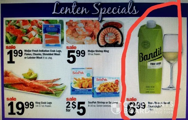 Pretty put off that in big bold at bottom of this week's ad (3/12/17), it reads lenten special then has pics of shrimp, fish, crab legs, along with three thieves wine! Really? Kind of a ad 'subtle' slap in the face. Someone was really not thinking when they did that. I mean come on. I get the whole lenten specials with fish, and I don't complain that catholics drink, but very poor choice of 3 thieves if you are catholic there were 3 crucifixtions on that hill - 2 thieves and jesus. I'm really put off by this
