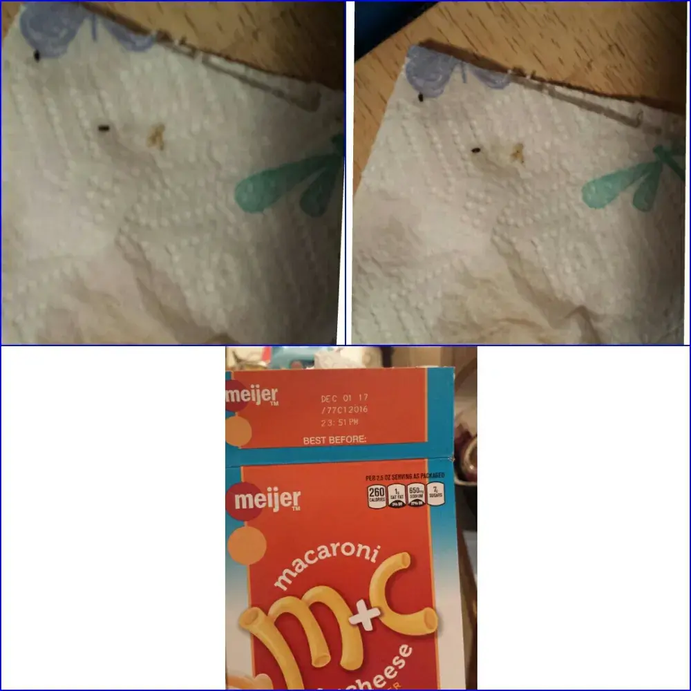 I found little black bugs as we'll as what looked like white larvae in the noodles. I'm nit sure what kind of bug, but needless to say I was so glad I noticed them before I served it to mu family!... I love meijer brand food, because it saves on my families food budget. I really hope to hear from customer service so I can feel confident that this won't happen again.. Thank you for taking the time to hear me out.