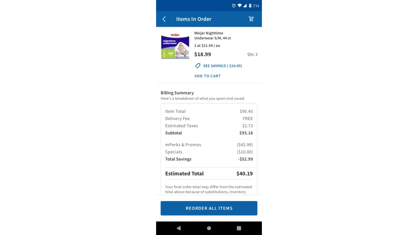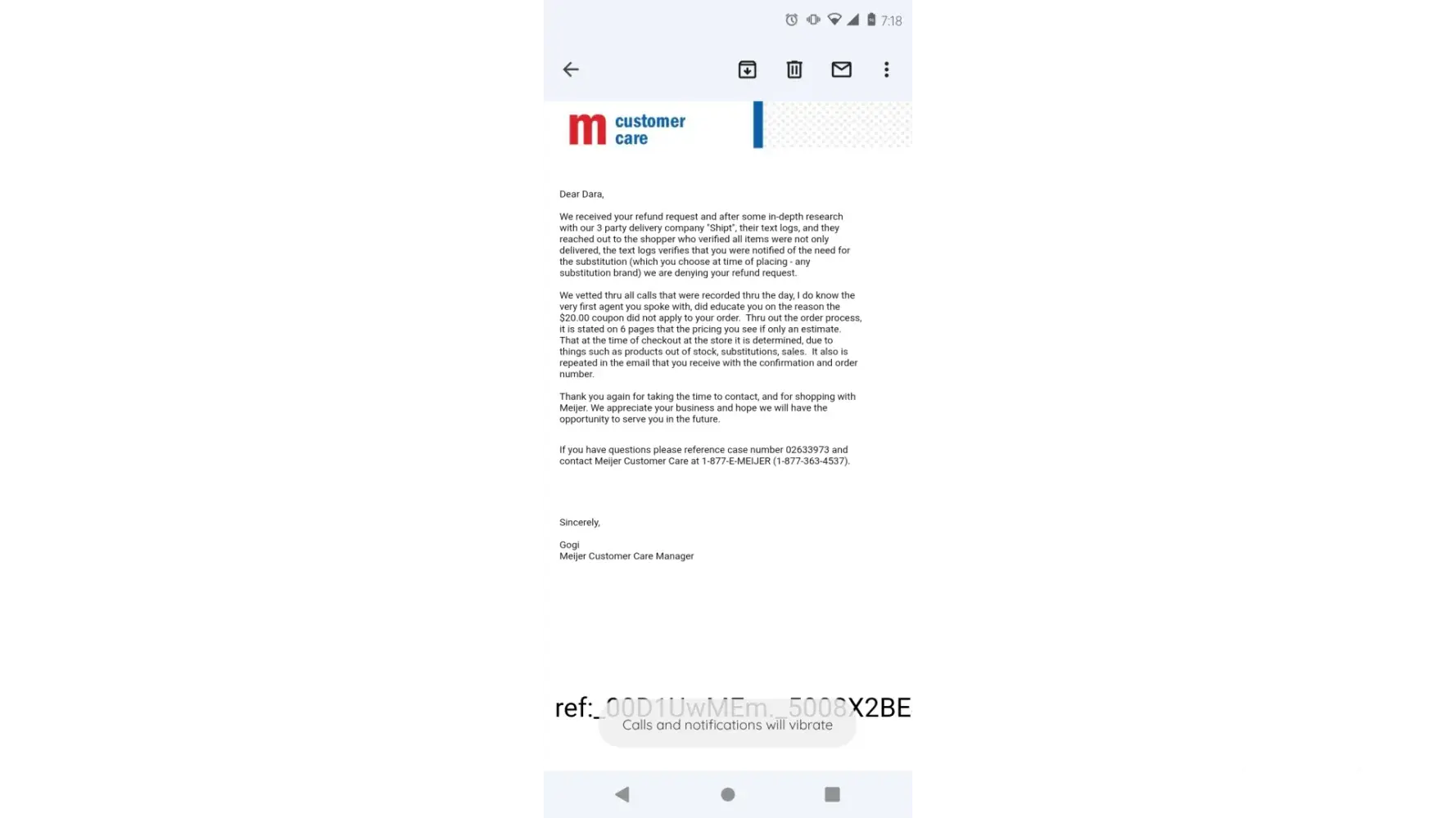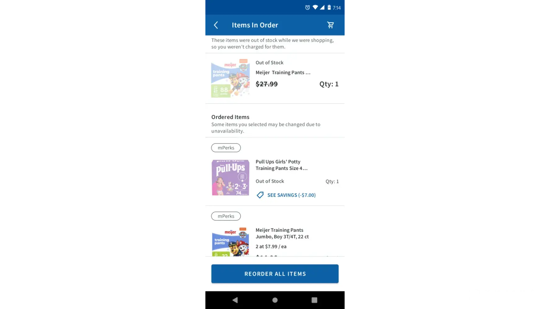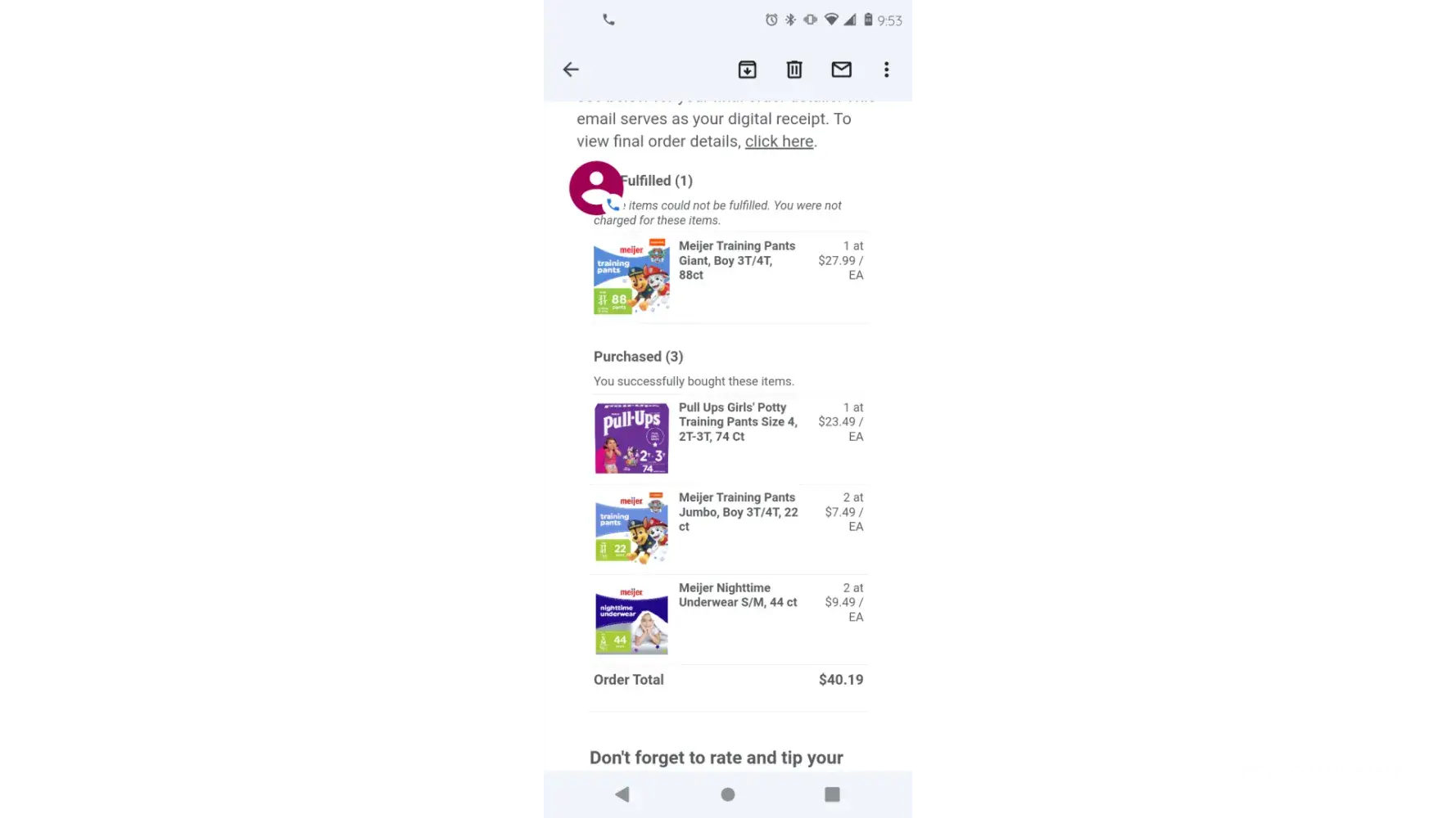On 8-29 I placed a order via Meijer app we was doing diaper charity so I seen meijers had all these fabulous coupons that I used I ordered 4 items Meijer 88 ct training pants 74 count pulls and 2 44 ct Meijer overnight pants which was buy 1get 1 free. My order came to 24.52 for those 4 items which is a fabulous deal.on 8-30 my items was being shopped for by a shipt shopper which I also had a coupon for free delivery and my 24.52 order will be delivered by 9 and there is a view button next to this info so I hit view and see that some items was not in stock which was the 88 count and 74 CT so I wasn't being charged for them but my total went up to 40.19 so I called Meijer trying to explain I was over charged they began telling me a 20 coupon didn't go thru on my order that's why it's 40.19 I said that don't make no sense cause it's a 15 dollar different she begins telling me she can't help me I'm lying I never place a order for 24.52 and it went up cause of the substitution which still didn't make since considering the substitution was less in count and money then what I originally ordered so I received my order once I got off work and relaxed only 2 items was delivered which was the substitution so I called Meijer again to request a refund at this point and was told no that I'm lying about everything by a rep named gogi so shipt is supposed to take pics of their deliveries is what I was told by shipt and my driver failed to do so he said he delivered 5 items meijers email says 3 items were delivered when only 2 items got delivered I received a email saying from Meijer shipt is telling the truth and I'm lying and my refund is being denied I have screenshots of everything