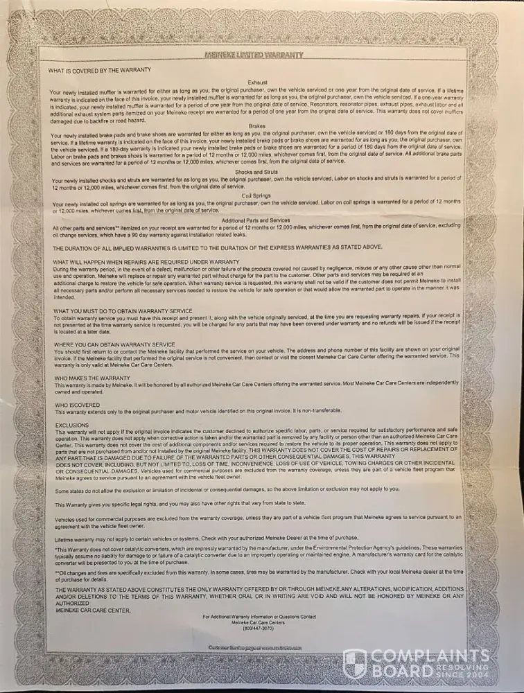 I called Meineke [protected]) online and on the phone and I file a complaint. Next is Arizona Attorney General, BBB, social media and internet review sites.