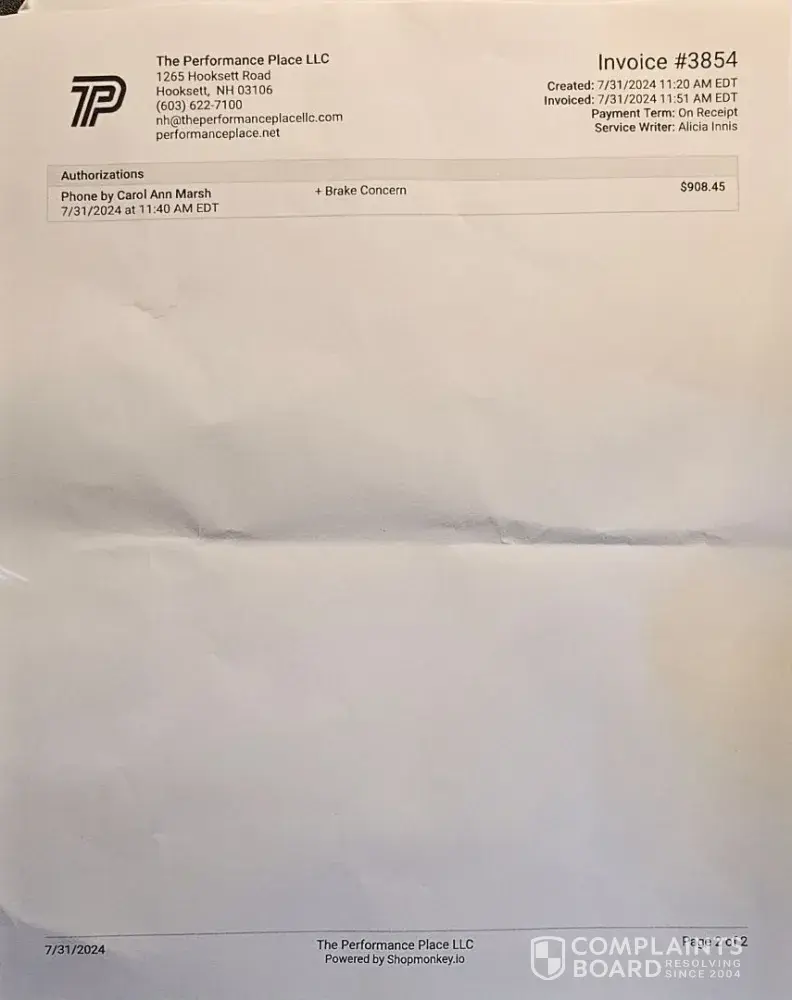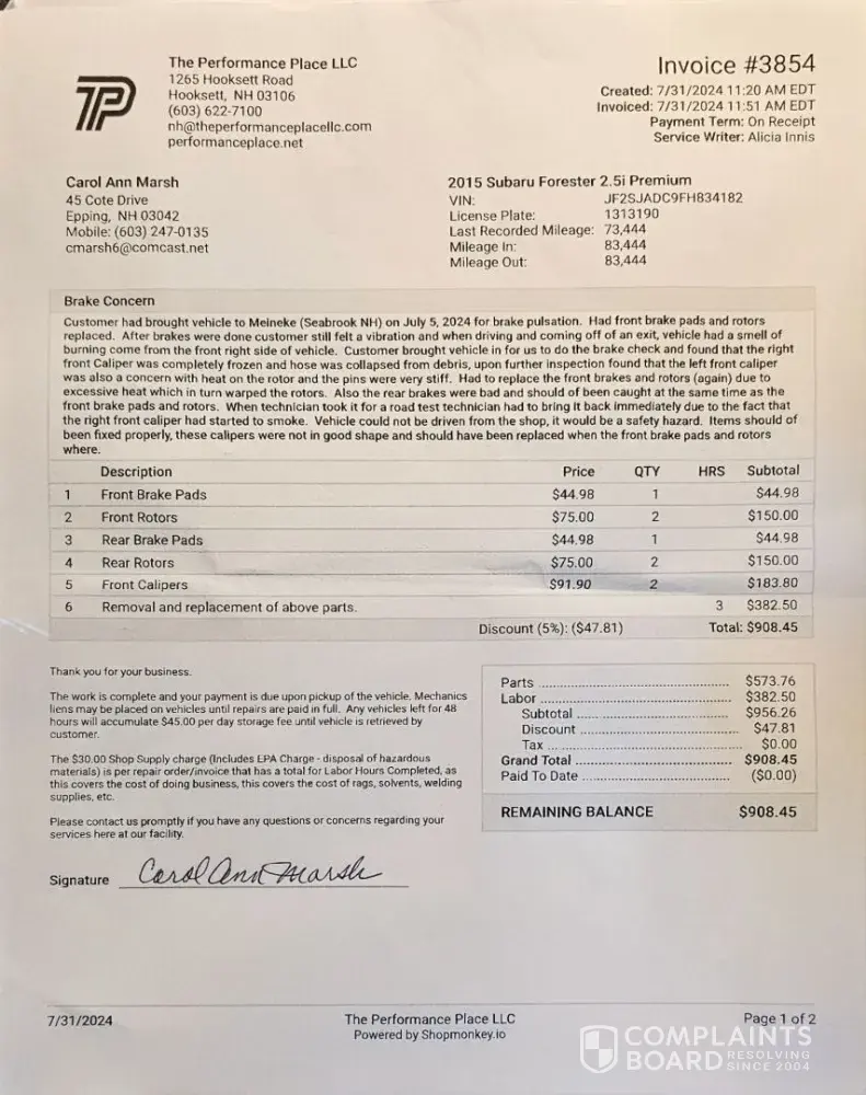 Within a few weeks, the pulsating was getting worse, and on Sunday, July 28th, coming off the highway I smelled burning while braking. I was near The Performance Place, LLC in Hooksett, NH, so I drove there to see what was the problem. They found the problems with the brakes, and the owner, Alicia Innis, included her comments in the attached invoice. While in the midst of having my brakes fixed by The Performance Place, I decided to contact Meineke in Seabrook and spoke to Tom. Both Alicia and I explained the issues with the brakes and calipers, and Tom responded,"If the vehicle is not here, I can’t help you." We explained I couldn't drive my car to Seabrook for fear of fire.