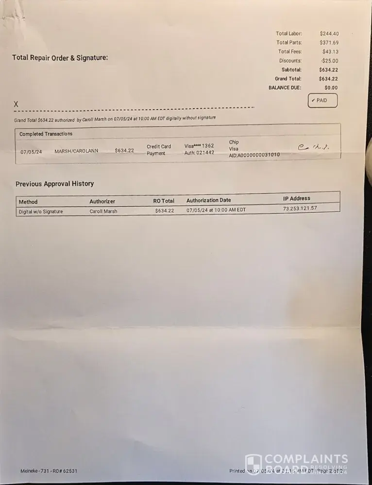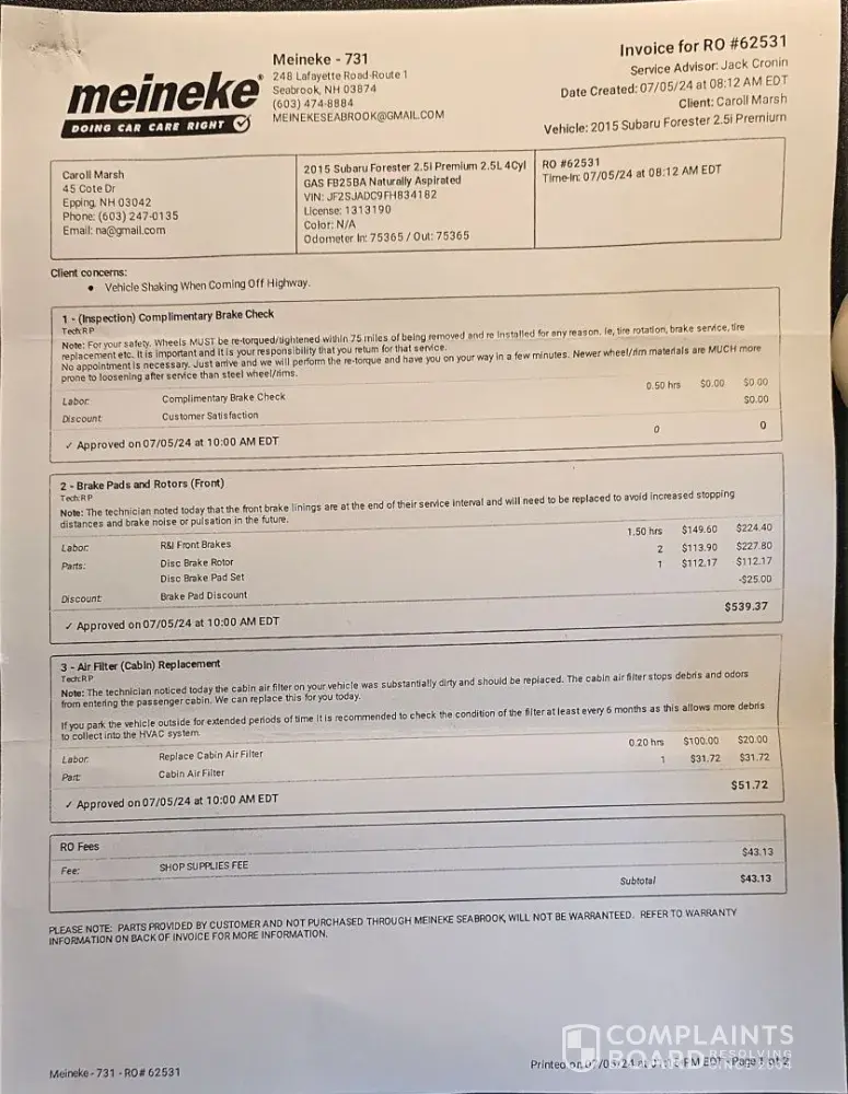My name is CarolAnn Marsh. I drive a 2015 Subaru Forester, and beginning in the middle of June, 2024, I was experiencing a pulsating when I applied my brakes. In the past, I frequented Meineke in Derry, NH and was very pleased with the service. Living in Epping, NH, the closest Meineke is located in Seabrook, NH, so I made an appointment for July 5, 2024 at 8:30 a.m. to have them check my brakes.