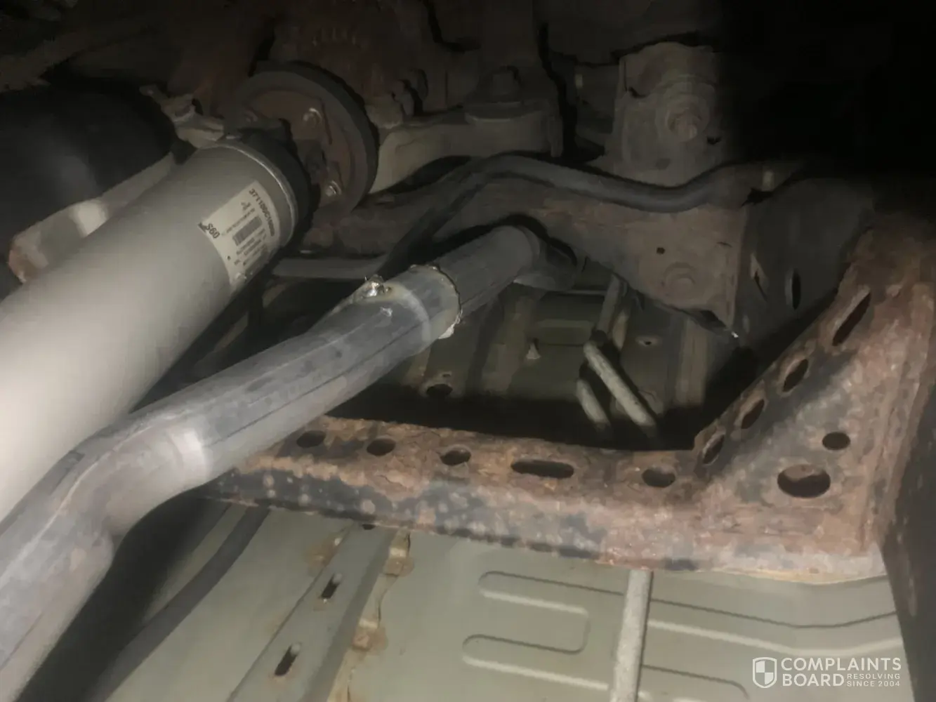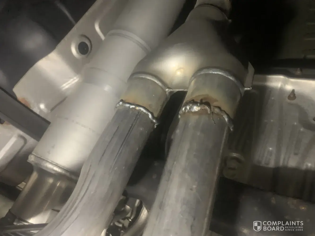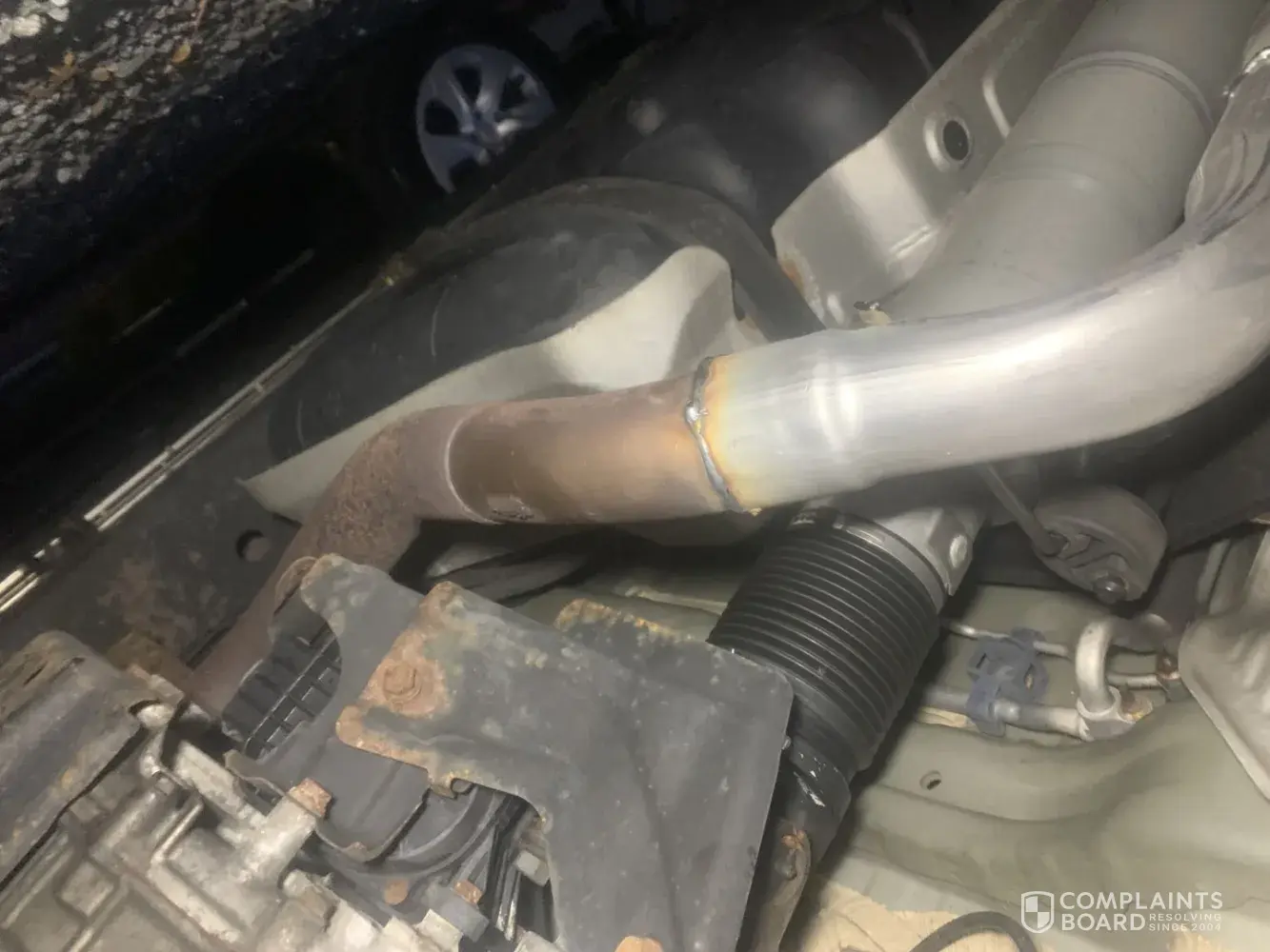 Once the car was taken to Ford, we learned that several brackets were not reinstalled on the vehicle after the installation of the catalytic converter and turbo. Basic frame parts were missing as well as the actual bracket to connect the catalytic converter to the turbo. This was likely due to the service installation being a complicated process requiring removal of the front axles, etc. in order to get the catalytic converter and turbo installed.