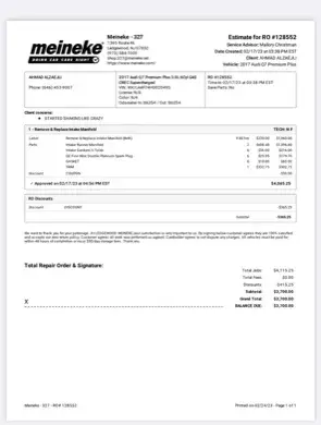 Progressive is now requesting a copy of the invoice due to the disparity in prices quoted by Meineke in order to complete the estimate. I am requesting your assistance so that my insurance can get the required documents to complete my claim and work completed to so that i may get my vehicle.