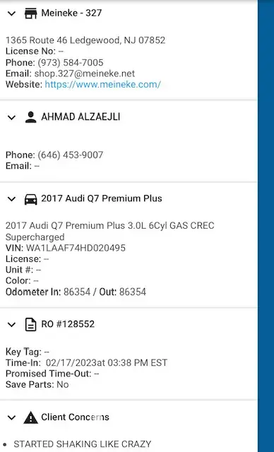 I took my car Audai Q7 2017 to this Meinke at Ledgwood, NJ, due to an emergency technical situation on My way back to New York City with my family on Friday 17 February 2023.