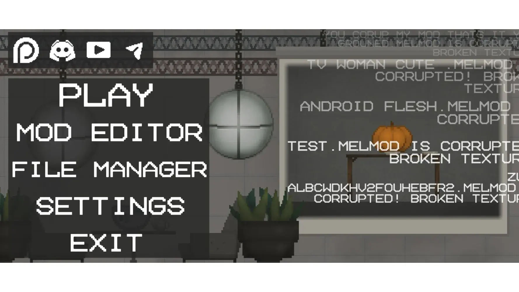 I have a request for you to add a mod to the game request is to add a potion that can make a melon become alive and well run away and maybe battle each other The way for them to battle each other is you can use the alive potion on as many melons as you want and you can throw a melon at another one and they will get ticked off and fight I also have a request for a new map for anyone that wants to build their own for a personal map that they will only have unless they share with others The way they do that is you can put add your own and then give them everything to make a torture room or some thing creative when I say everything to make a room I mean they can start off with a huge box and work their way up to make a torture room for the melons I hope you accept my requests make your game more popular in fun to play oh and I’m sorry when I said you see a light potion I mean if you use the alive potion they can make the mountains active move and run away as if real humans would do so if there’s a room and you try to drown them then you can do what you want with them but when you don’t touch them they might run away If they’re scared thank you for your time. oh I also forgot to mention to make your own map you can have several of your own maps you can’t just have one click on make your own map and then you make a map and you can use that or the other ones you guys made and if you want you can make it another one why stay having the one you made previously thanks for that buddy