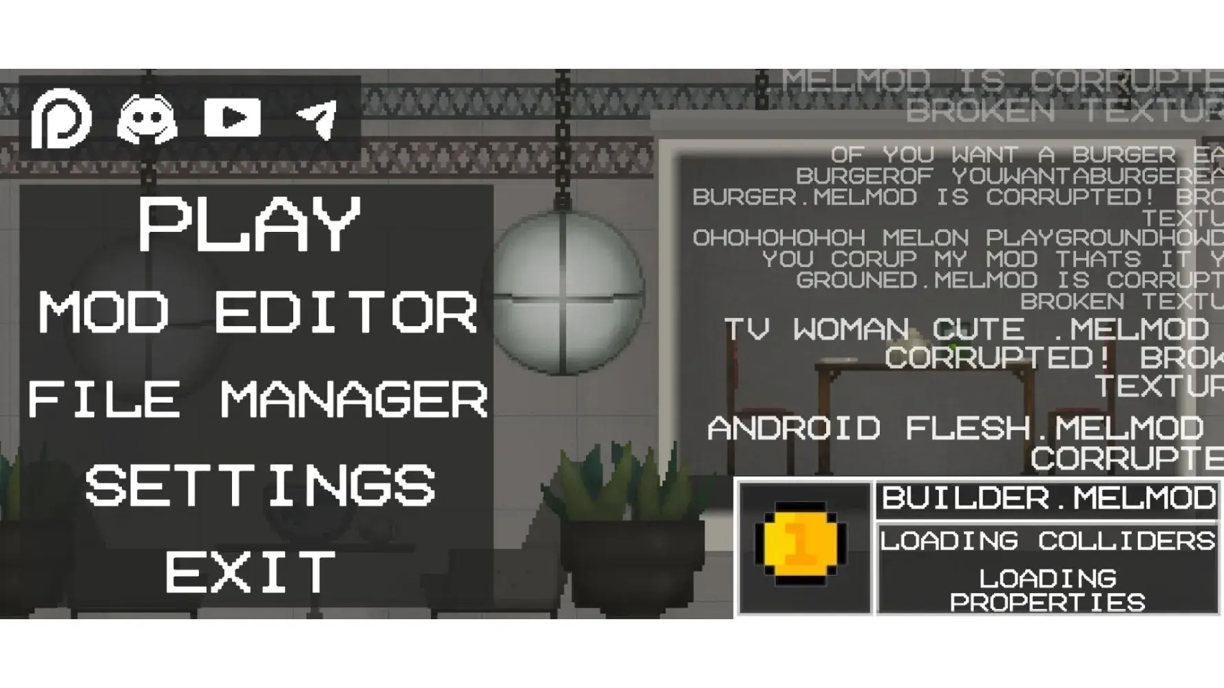 i love it but no music pls add music and add mod button brings you to google and you dont have google thats ok you download mods from melmods and make a app thats called “melmod†can u pls add people and make emotions when the verson is 11.0 and add 100+ more characters into the game and add everything from people playground also add a playground map and school map and cars and new wheels and add a Hennessy venom f5 its a car and add 32 wheels to the game and 32 power wheels and add 5 engines to the game and pls make a app called people playground and add all items from the pc people playground and make 99+ animations and add 165+ liquid to the game and make it realistic and add shaders and make all the maps have grass and mountains far away and make more foods like chicken nuggets and make mcdonald's map add money to the game and add weather to the game to make it more realistic and add 250+ items to the game and make a video trailer which is 3D melon playground and add plants to the game and add houses and add a city map and add sonic character to game and make the city map 50 times bigger than every map in the game and add pizza to game and add 50+ armour to the game and add talking to the game and add cats to the game and add 100+ pets to the game and add a new secret