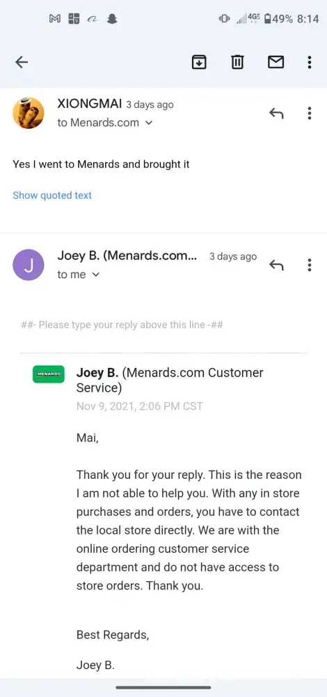 Home Depot and Lowes have very accessible customer service reps who work with you. This is the first time I ordered material with Menards and I'm astonished at the absolute wall Menards has around customer contact.