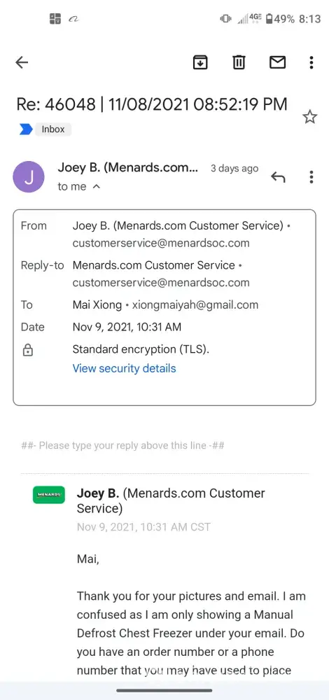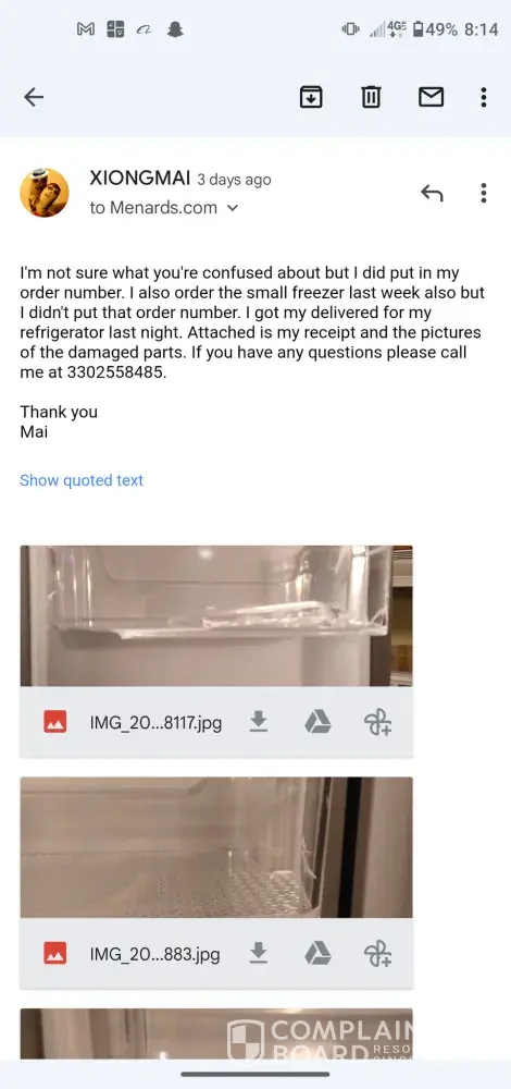 address is 7800 Lakeland Avenue North, Brooklyn Park, MN [protected] Phone number is [protected]. My delivery date was Monday 7th, 2021. When I got my refrigerator at 7:30PM and to find out that my clear item holders was crack and broken. I called customer services and they told me to contacted Menards online under "damaged Items". Attached is the email I file for damage goods and Joey reply back to me that he won't able to help me due because I brought at the store. So he has no access to looked up my number. I then contacted the delivery service on my Delivery Agreement and turned out that no one has respond back to me. I'm upset because I'm spending alot of money on my refrigerator and to find out it was damage and no ones wanted to helped me with it. All I want was just to replace the damage items. Attached is all the conversations and invoice.