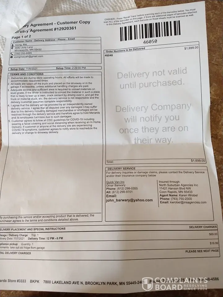 On Nov. 6, 2021 I brought my new refrigerator from Menards Store #3333