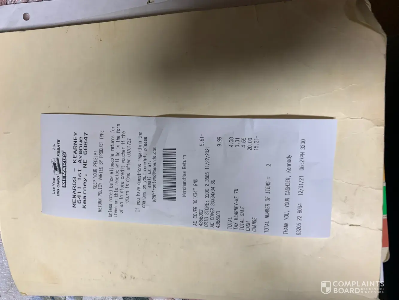 About 2 weeks ago, I sent a complaint form into the corporate office via snail mail. I was told by our local Menard's (Lancaster, OH) that I could expect to hear back from someone at corporate regarding my complaint. I have not received any calls from you that I am aware of. I would hope that if someone calls and I am unable to answer that they would leave a message. I am trying to find out what your response is to my request. I tried calling, but the recording only states to send a letter via USPS or an email. Now, I hope to hear from you since I have now tried all my options. What happened was that when we picked up and installed our new countertops, afterwards I realized that the two sides of the kitchen did not match. Our local store has since replaced the incorrect side.