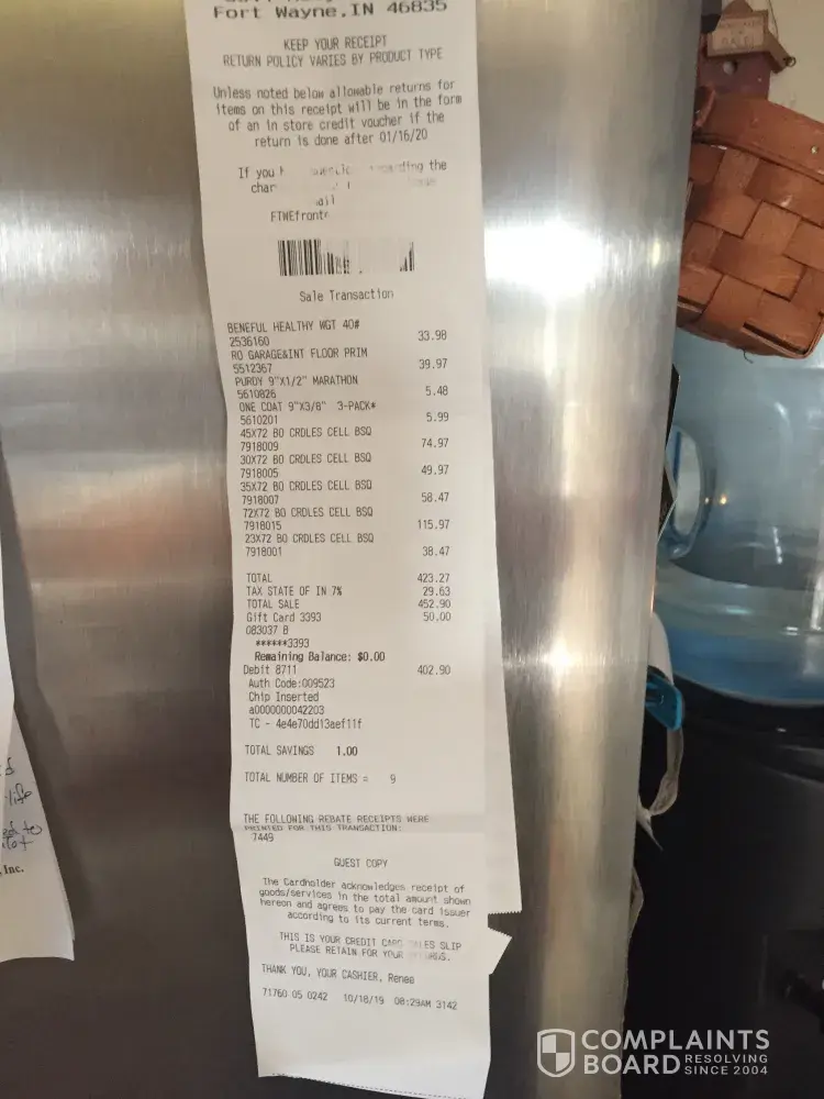 On July 3, 2019 we purchased materials for a deck totaling $9733.51 and turned in rebates for the decking boards which we received. The next week the 11% was advertised so I went back and got the form for the 11% price adjustment and told to send in original store receipt, they even made me a copy so I could send original which I did. I calculated the 11% adjustment would be around $671 but on August 1 I was issued a refund for $6.93. We did return some items totaling $256 and $322 . I have contacted Rebates International and they said I didn't send the original receipt, I replied that I did and to please review this and they sent back that I did not follow the guidelines and no rebate will be issued. Of course I have no way to prove I followed instructions other than for this amount involved why would I risk not following the rules? I realize I won't get the $671 because of the returns but still a significant amount is due back to me. Is there anything else I can do? V Keesbury