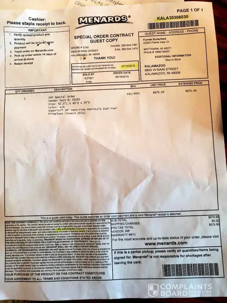 On 06/16/19 we placed a special order for a vent free fireplace on order KALA30306030 at store # 3150, after we had checked with Menards over 1.5 months earlier while in the planning phase to see if this product was available, and assured that it was. However, at 8:15 pm on June 26 we receive a voicemail from Menards stating this order has been canceled as it is no longer supplied by your vendor. This is all after we had downloaded the specs from your website and began the demolition and building IT TOOK 11 DAYS FOR US TO FIND OUT ABOUT THE VENDOR NO LONGER MAKES THIS PRODUCT? In the meantime, our house has been torn apart waiting for this delivery. Walls have been removed and we are in full construction mode waiting for this delivery. I understand this was a special order, but if the order had been placed when paid for, we would have found out that we couldn't get this product and we would have not started the demolition. There isn't much for Menards to do for us other than refund us, which they stated they would be doing, but my frustration level is to the point of not wanting to make Menards my first choice of stores whenever I have a large project to be completed ever again.