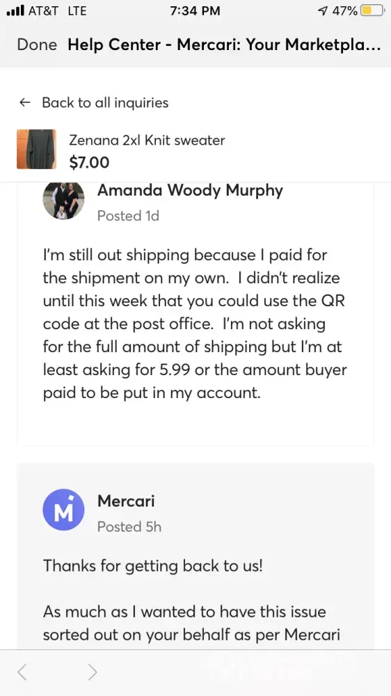 Desired outcome: Mercari reimbursed me for my product.